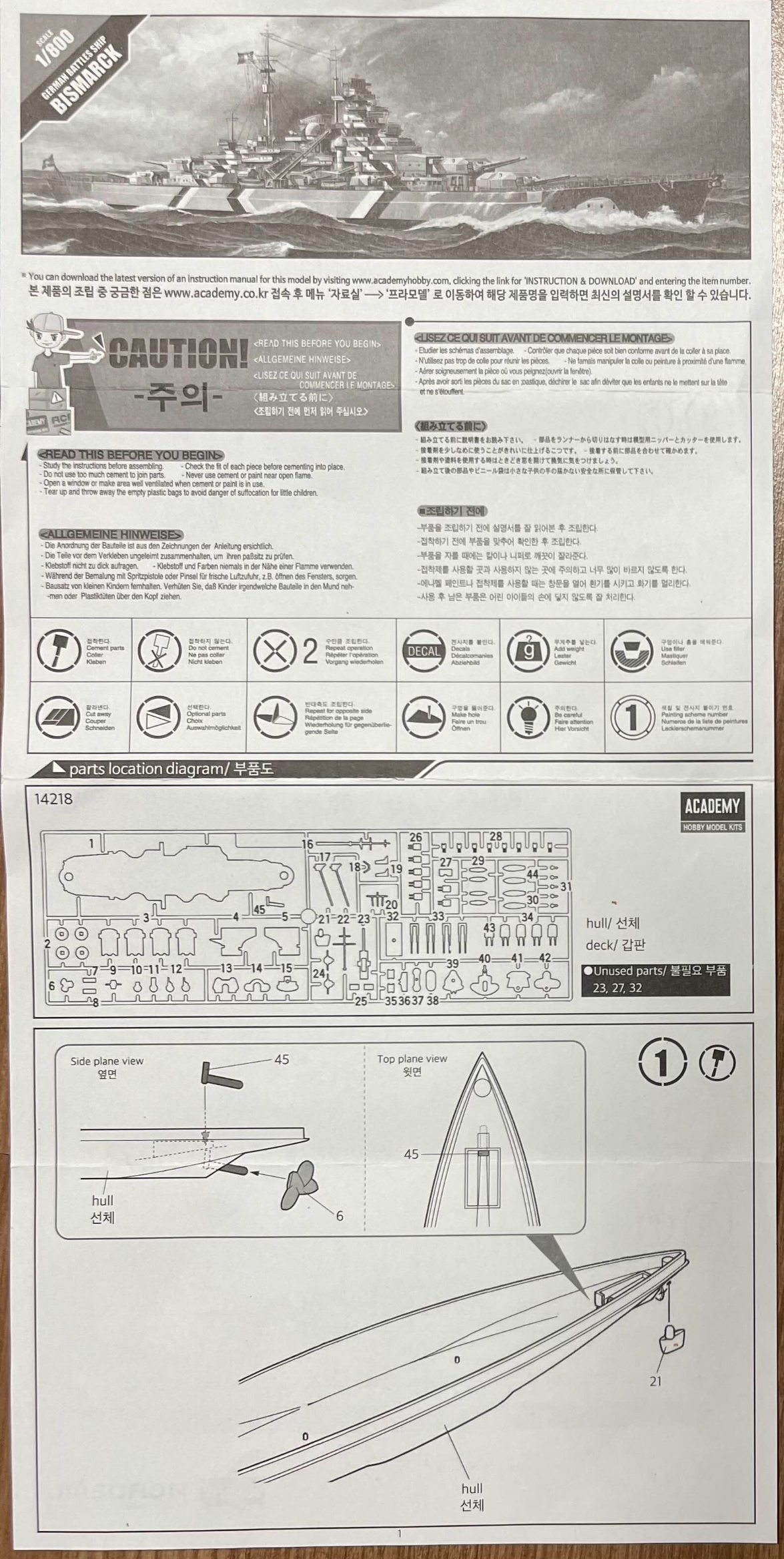 먼저 설명서를 보면 부품도 나와 있고 나름 요즘 발매되는 설명서와 비슷한 구성이다. 그렇지만 1/800 스케일이라 그런지 세부 설명이 그리 많지는 않다. 그래도 F-16 보다는 낫다.