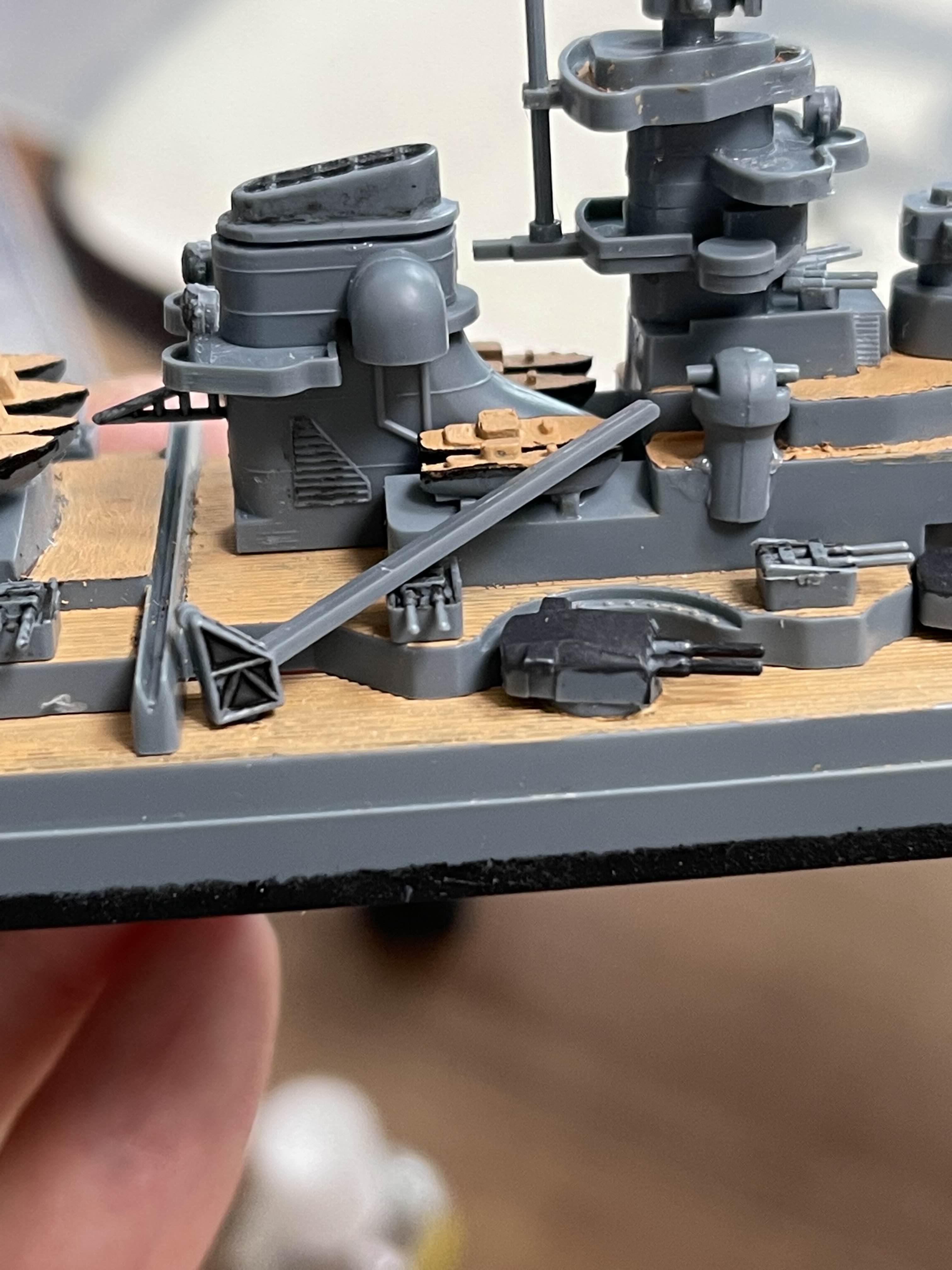 이렇게 저렇게 돌려봐도 간섭으로 인해 저렇게 들뜬 형태가 된다. 그래서 강제로 각도를 위로 더 올려 주었다. 유난히 넓적하고 길어서 함재기를 위한 캐터펄트 아닐까 하는 생각도 했었지만, 실제 캐터펄트는 크레인 뒤에 보이는 함선 좌우를 가로지르는 V자 모양의 홈이 파인 곳이다. 참고로, 이 모델에는 함재기는 포함되어 있지 않다. 암튼 크레인 모양이 저렇게 표현된 것은 1/800 스케일 모델의 한계라고 볼 수 있다. 좀 더 상세 모습이 나온 자료나 1/350 스케일 모델을 보면 이것이 크레인이라는것을 알 수 았다.