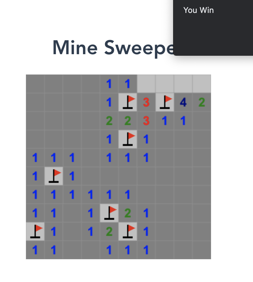 } else if (!box.revealed) { self.cleared++ box.revealed = true self.drawBox(box) if (box.value == 0) { self.traverseBoxes(x, y, self.expandSafeArea) } if (self.cleared == self.target) { alert('You Win') self.gameover = true } }또한, expandSafeArea에서도 상자가 열릴 때 마다 cleared 값을 증가해 주도록 한다.