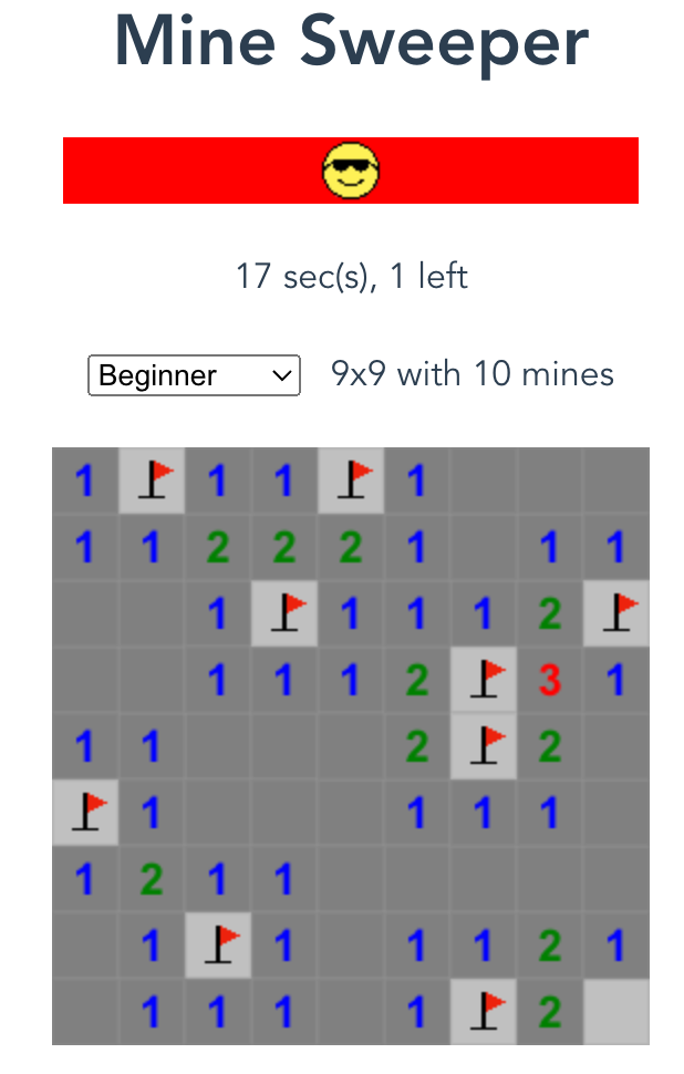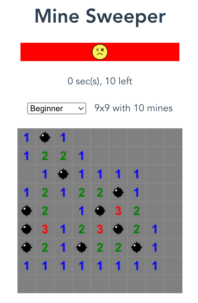 if (evt.button == 0) { // left self.drawFace(CONST_FACE.surprise) if (self.rightTimerId) { self.drawFace() clearTimeout(self.rightTimerId) self.rightTimerId = undefined self.examine(x, y) return false } self.leftTimerId = setTimeout(() => { self.drawFace() self.leftTimerId = undefined self.dig(x, y) }, dblclick_wait) } else if (evt.button == 2) { // right if (self.leftTimerId) { self.drawFace() clearTimeout(self.leftTimerId) self.leftTimerId = undefined self.examine(x, y) return false } self.rightTimerId = setTimeout(() => { self.rightTimerId = undefined self.flagup(x, y) }, dblclick_wait) }그리고, 눈에 잘 띄게 만들었던 빨간색 Canvas 배경을 없애준다.
