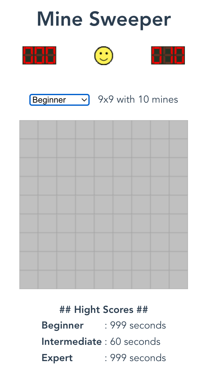 setHighscores(level, elapsed_time) { let record = elapsed_time switch(level){ case 'beginner': if (elapsed_time < this.highscores.beginner) { this.highscores.beginner = record } break case 'intermediate': if (elapsed_time < this.highscores.intermediate) { this.highscores.intermediate = record } break case 'expert': if (elapsed_time < this.highscores.expert) { this.highscores.expert = record } break default: return } localStorage.setItem('highscores', JSON.stringify(this.highscores)) }그리고 실제 finishGame()를 게임에서 이겼을 때 호출되도록 코드를 추가한다.
