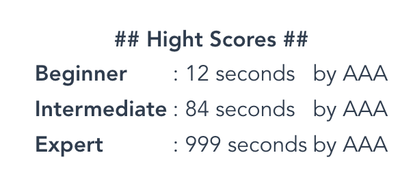 이 상태에서는 High Score Board가 형식에 맞지 않아 이상하게 나오게 된다. 따라서, 다음과 같이 HTML 코드를 변경한다.<tr><td><b>Beginner</b></td><td>: {{highscores.beginner.name}}</td><td>{{highscores.beginner.score}} seconds</td></tr> <tr><td><b>Intermediate</b></td><td>: {{highscores.intermediate.name}}</td><td>: {{highscores.intermediate.score}} seconds</td></tr> <tr><td><b>Expert</b></td><td>: {{highscores.expert.name}}</td><td>: {{highscores.expert.score}} seconds</td></tr>