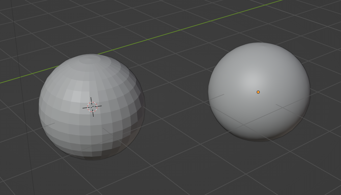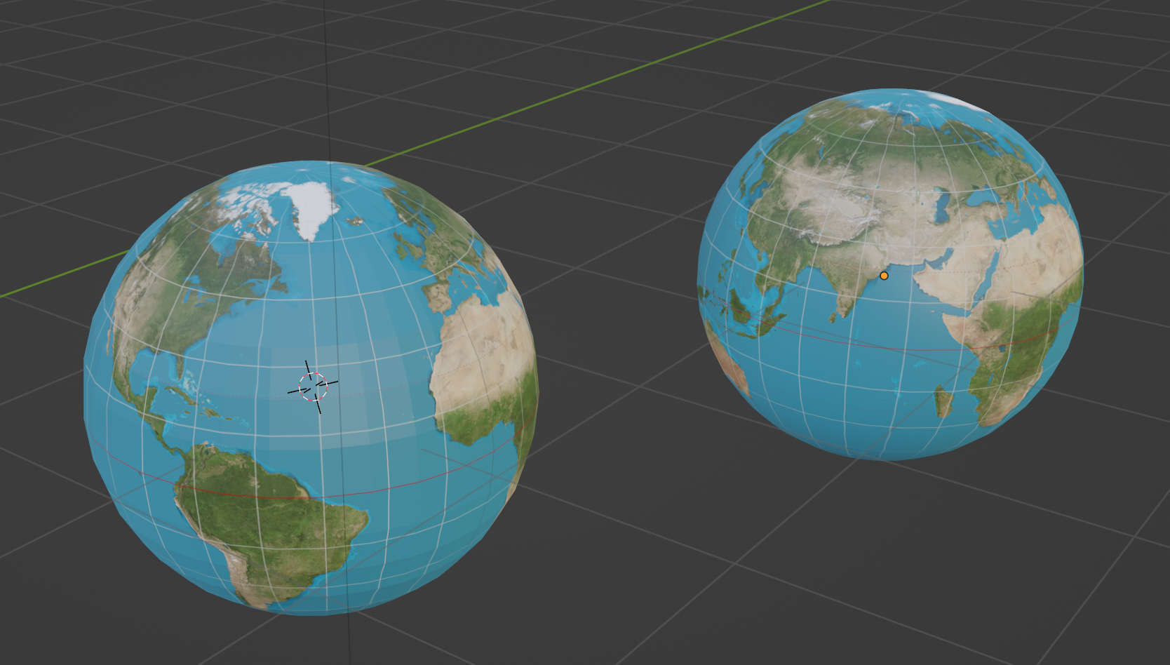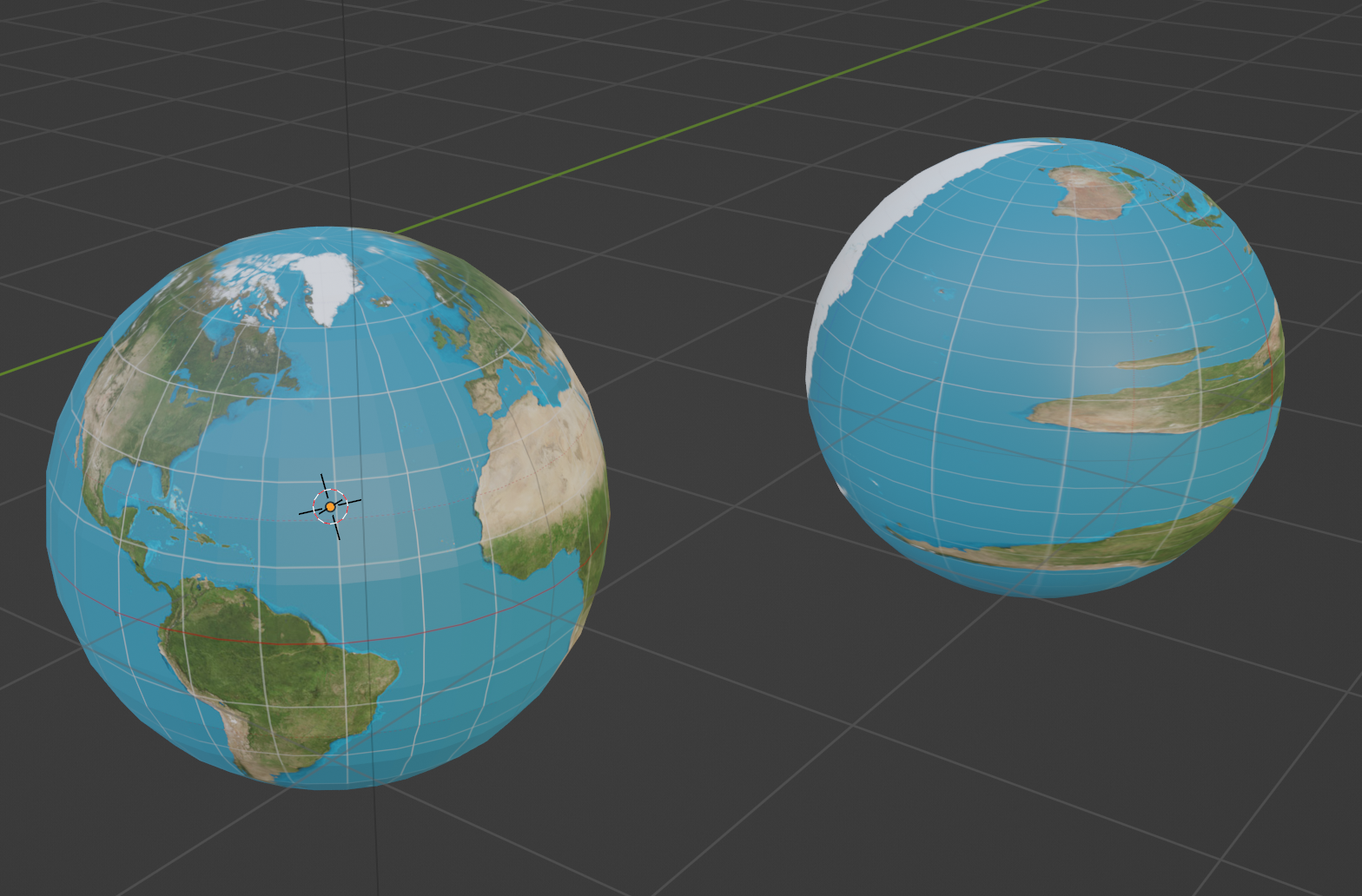 왼쪽이 UV Sphere 오른쪽이 NURBS Sphere NURBS로 만든 구체가 좀 더 매끈해 보이긴 하지만 나중에 rendering 된 모습으로는 큰 차이는 없다. 다만, Image Texture가 표면에 연결되는 Mapping이 다르기 때문에, 아래와 같이 같은 material로 설정하면 렌더링된 모습의 차이가 나는 것을 볼 수 있다.
