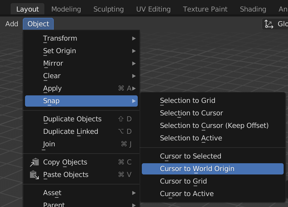 Snap을 이용하면 3D 커서를 놓을 때 좀 더 도움이 될 수 있다. Snap에서는 선택한 물체의 중심으로 Cursor를 이동시키거나, 커서의 위치로 선택한 물체를 이동시켜주기도 한다. Edit 모드에서는 Vertex를 선택하고 Cursor to Selected를 실행하면 해당 위치로 3D Cursor를 손쉽게 이동 시킬 수 있다.