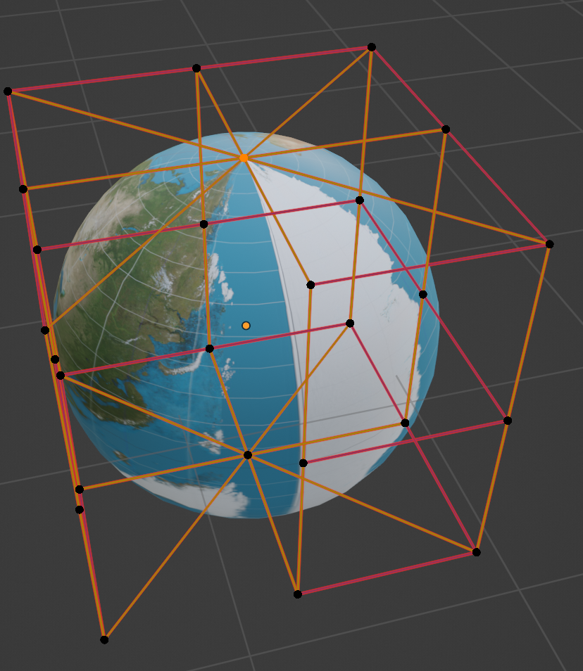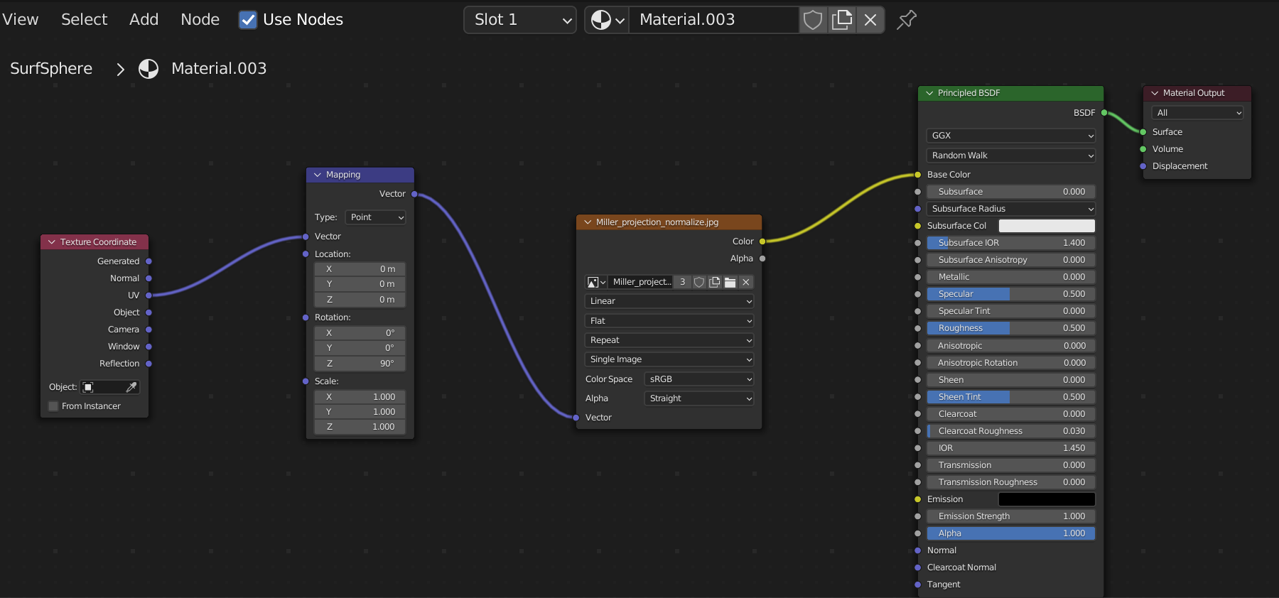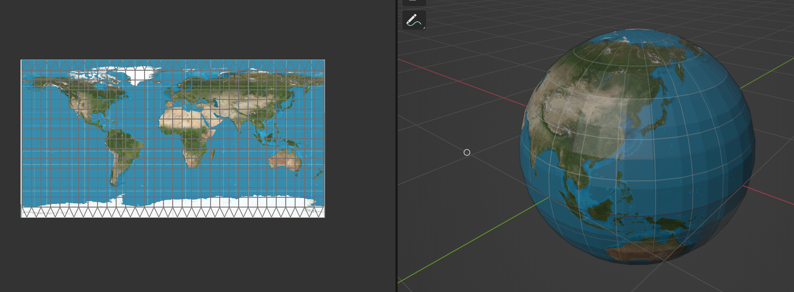 NURBS Sphere 편집 모드 따라서, 이를 UV Sphere처럼 보여지도록 하려면 90도 회전된 이미지를 준비하거나, 아래 이미지처럼 Material Node Editor에서 Texture Coordinate의 UV를 Vector Mapping에서 90도 돌려주는(Z축 90도 회전) 변환을 거치도록 하면 된다.