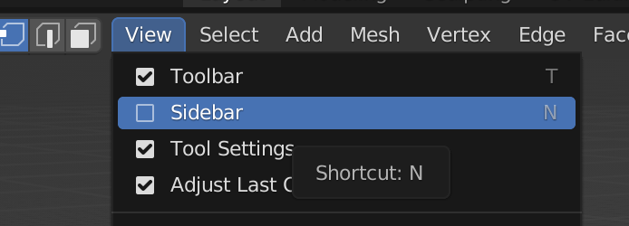 위의 Snap 기능을 이용할 수 있더라도 3D 커서의 위치를 정확하게 지정하고자 한다면 Sidebar의 3D Cursor 패널에 있는 정보를 확인하고 수정하면 된다. Sidebar는 View 메뉴에서 활성화 시켜야 화면에 표시된다.