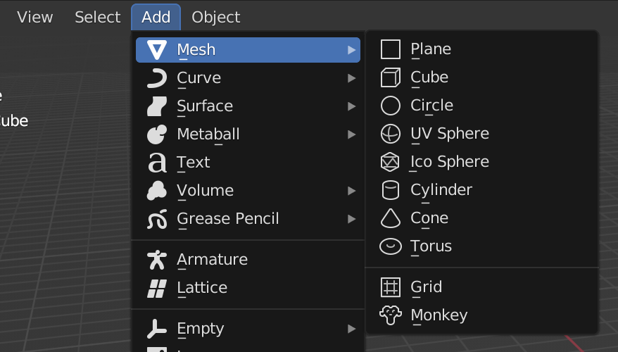 Mesh는 망사라는 뜻으로 3D에서는 물체가 망사 형태로 구현된 것을 말한다. Blender는 이러한 mesh를 모델링하는 도구로서 기본적 object 형태인 Plane(사각면), Cube(육면체), Sphere(구체)등과 같은 primative mesh를 제공한다.