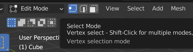 Edit Mode에서 어떤 것을 선택 할지 결정할 때 Vertex를 선택하면 해당 Object의 꼭지점을 선택 할 수 있게된다.