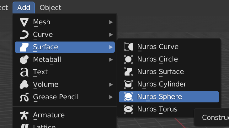 앞서 만들었던 구체도 NURMS로 만들 수 있는데, Surface 메뉴에서 NURBS로 구체(Sphere)를 선택 할 수 있다.