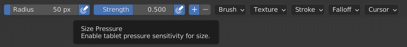 마우스만으로도 블렌더의 모든 기능을 사용할 수 있다. 하지만 몇 가지 사람의 섬세한 감각이 필요한 부분이 있는데, 그 중 대표적인 부분이 브러쉬 도구라고 볼 수 있다. 블렌더에서는 아래와 같이 브러쉬의 반경과 강도 값을 조절할 수 있다. 만약 사용자의 컨트롤러가 그래픽 태블릿이라면 스타일러스를 통해 사용자의 필압을 이 값으로 연계할 수 있는 기능을 제공한다.