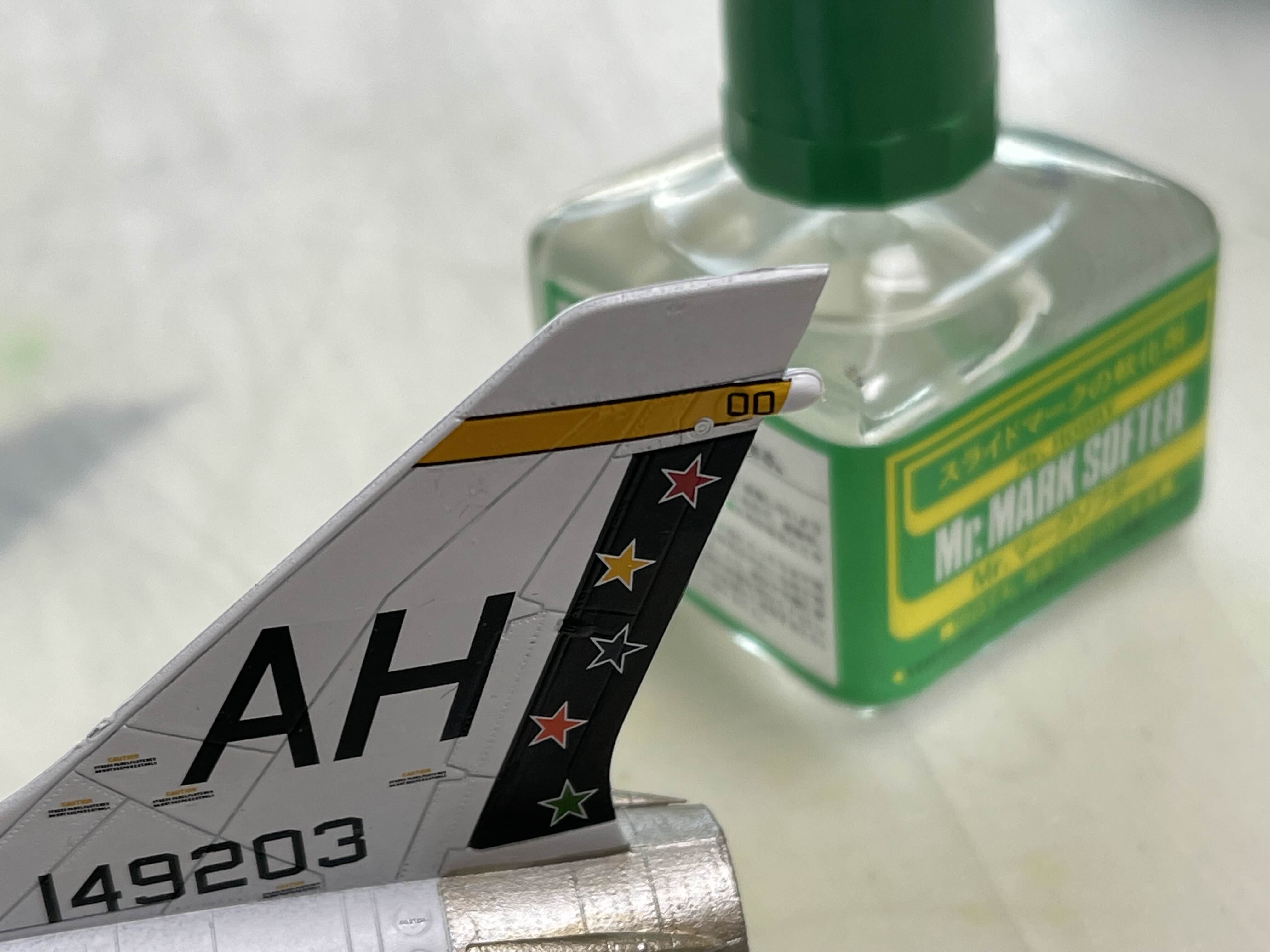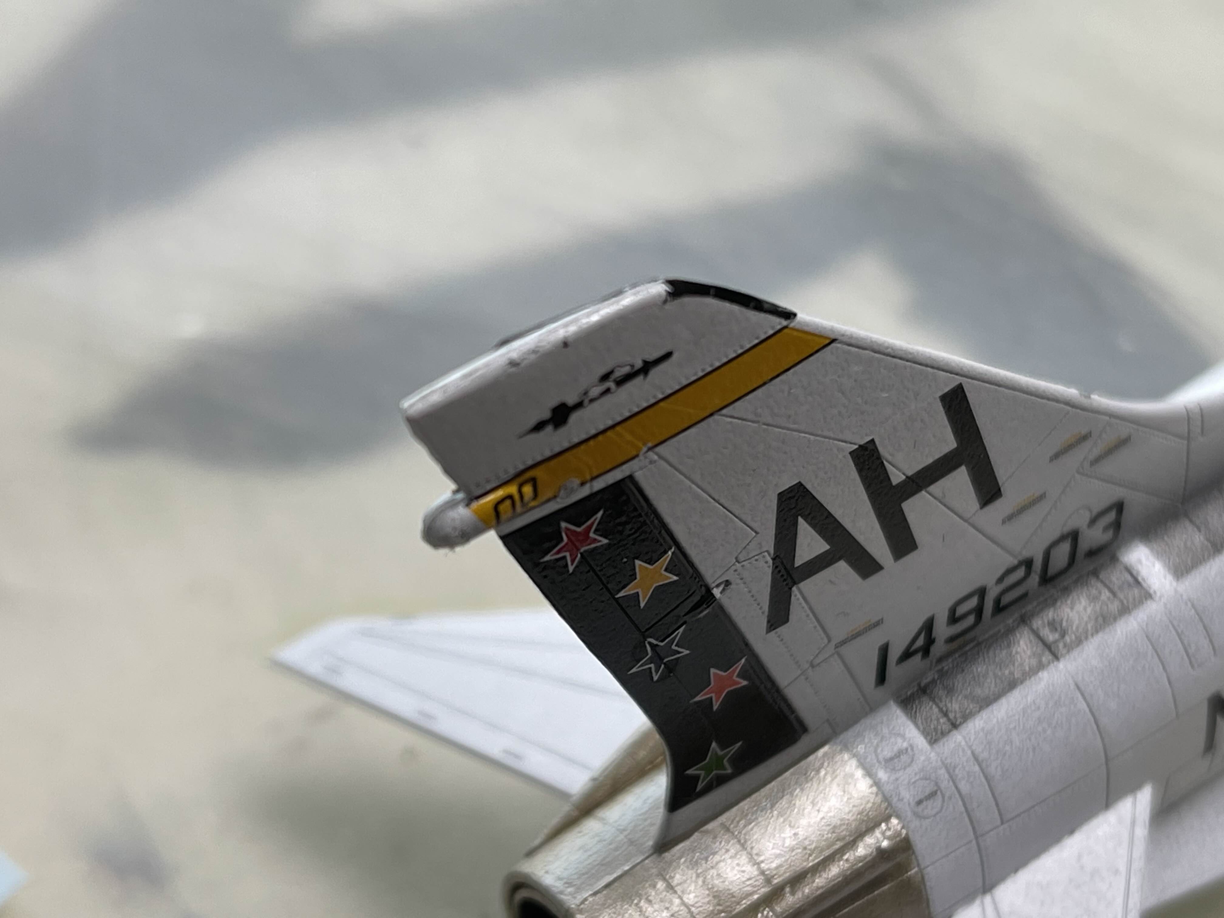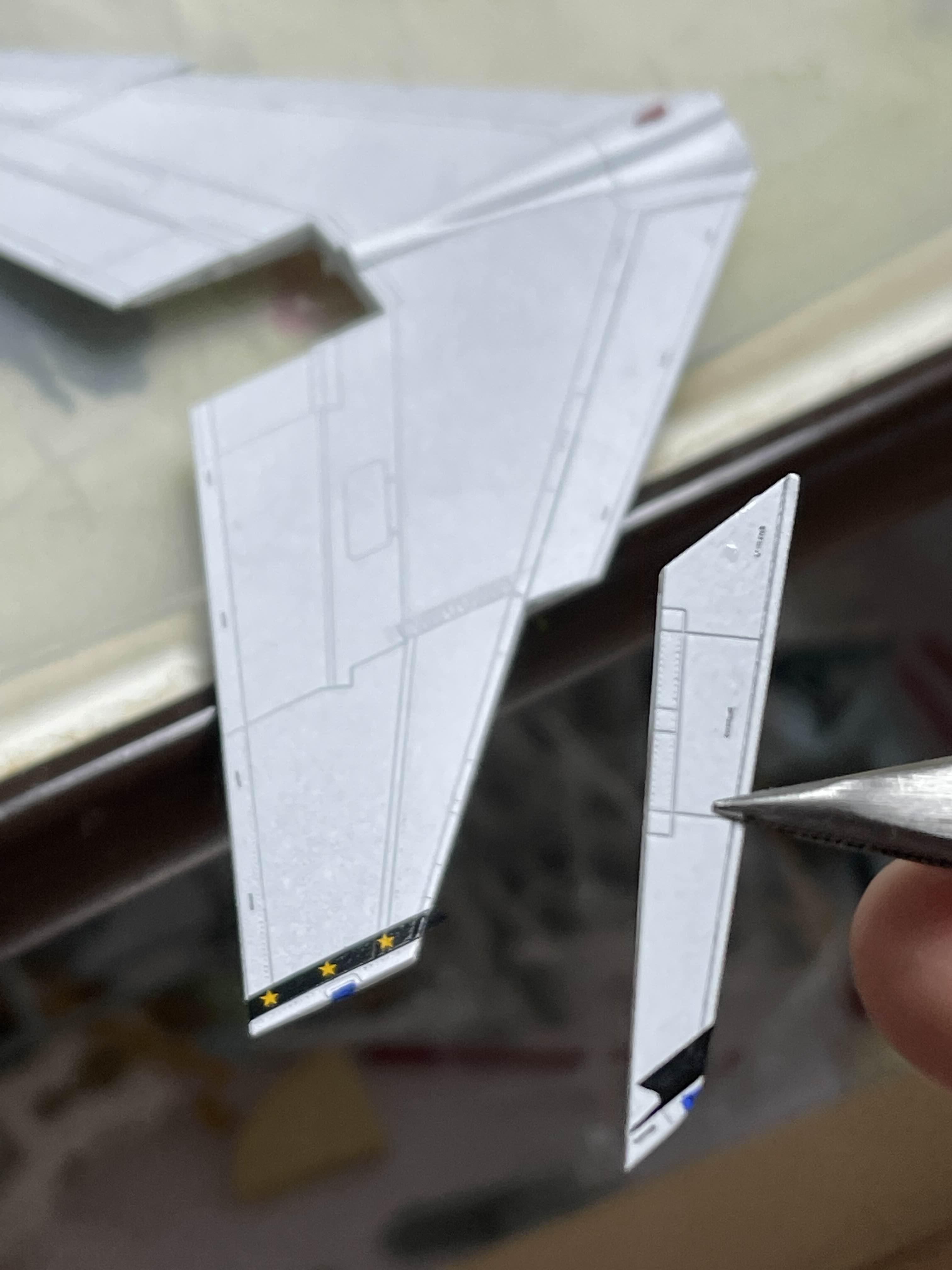 수직 꼬리 날개 제일 윗쪽에 검정색으로 제비꼬리 모양의 데칼을 붙여야 하는데 한쪽 꼬리가 끊어져버렸다. 이것도 위치 조정을 하다가 시간이 너무 지나서 뭉개져버렸던 부분이다.