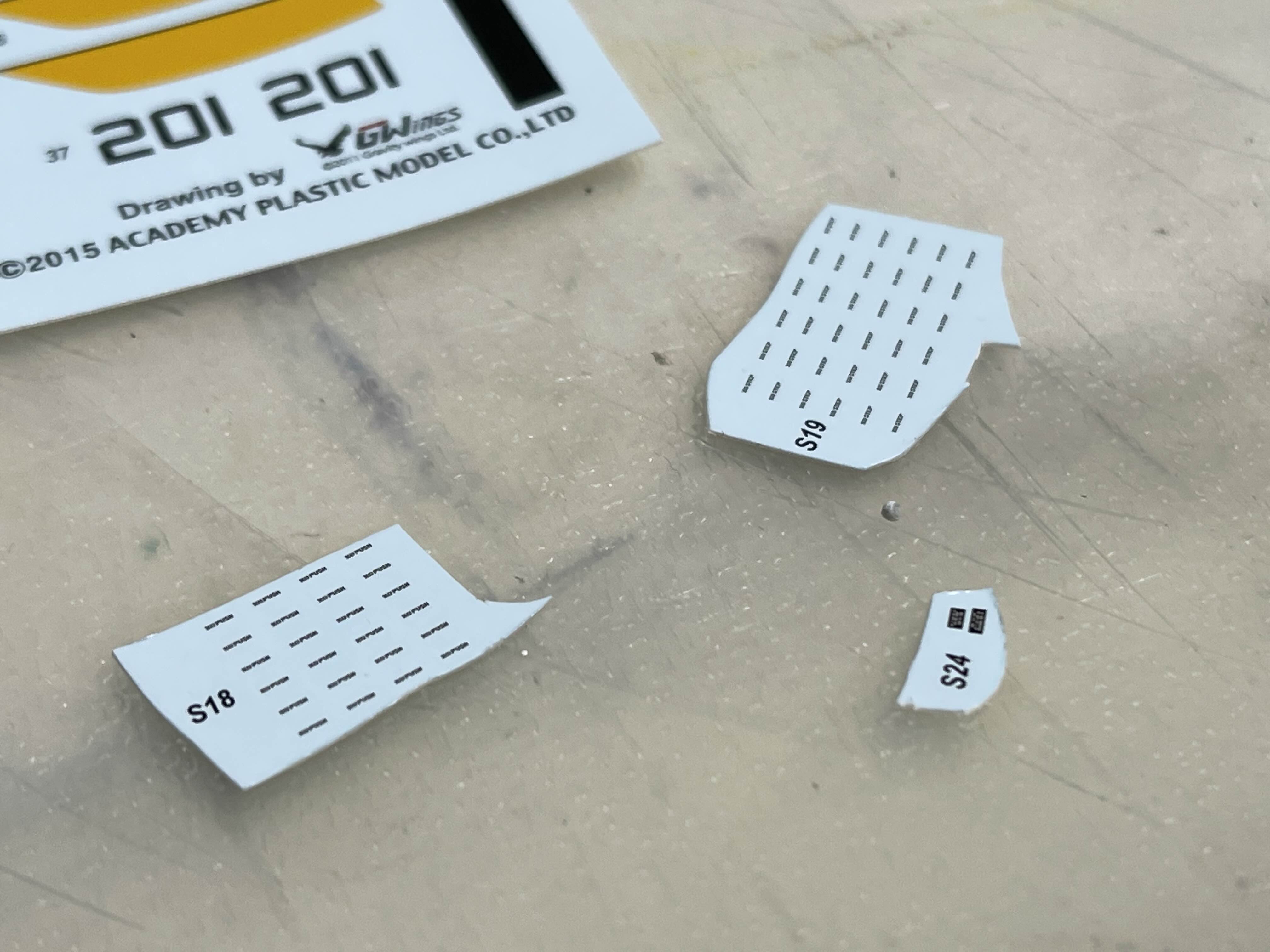 한 땀, 한 땀 데칼을 붙여야하는 부분은 본체라고 예외는 아니다 데칼을 붙일 때 조심해야 하는 부분이 바로 시간이다. 보통은 MARK SETTER를 바르고 그 위에 대충 맞춘 후 상세 위치 조정을 하게 되는데, 이 때 시간이 오래걸리면 데칼이 마르면서 위치를 수정하기 어려워지고, 또 잘못 움직이면 데칼 자체에 손상을 주게 되면서 결국은 사용을 못하게 되는 경우가 많다. 아래에도 오른쪽 검정색 네모 마크는 잘 붙여졌으나, 왼쪽은 붙이다가 실패해서 그냥 그대로 둔 상태가 되었다.