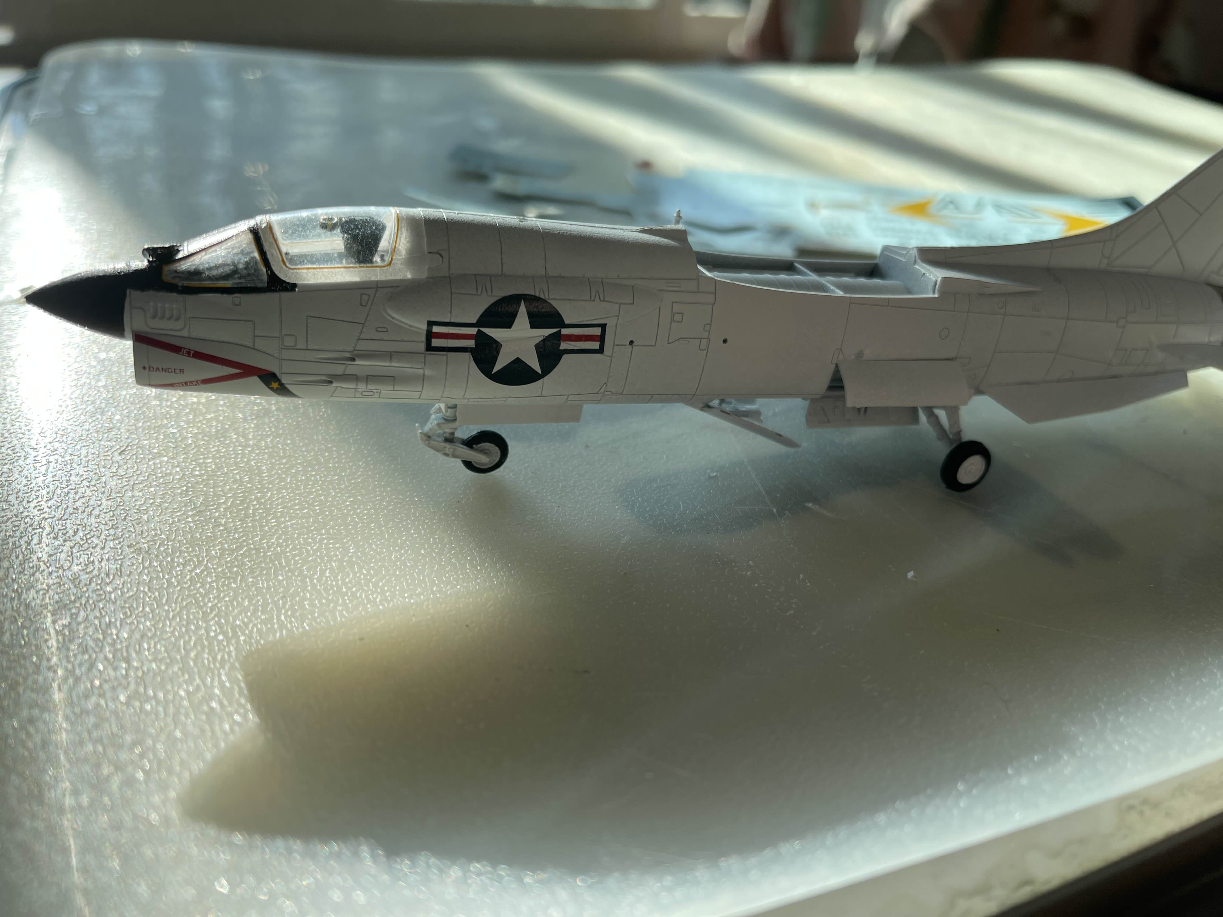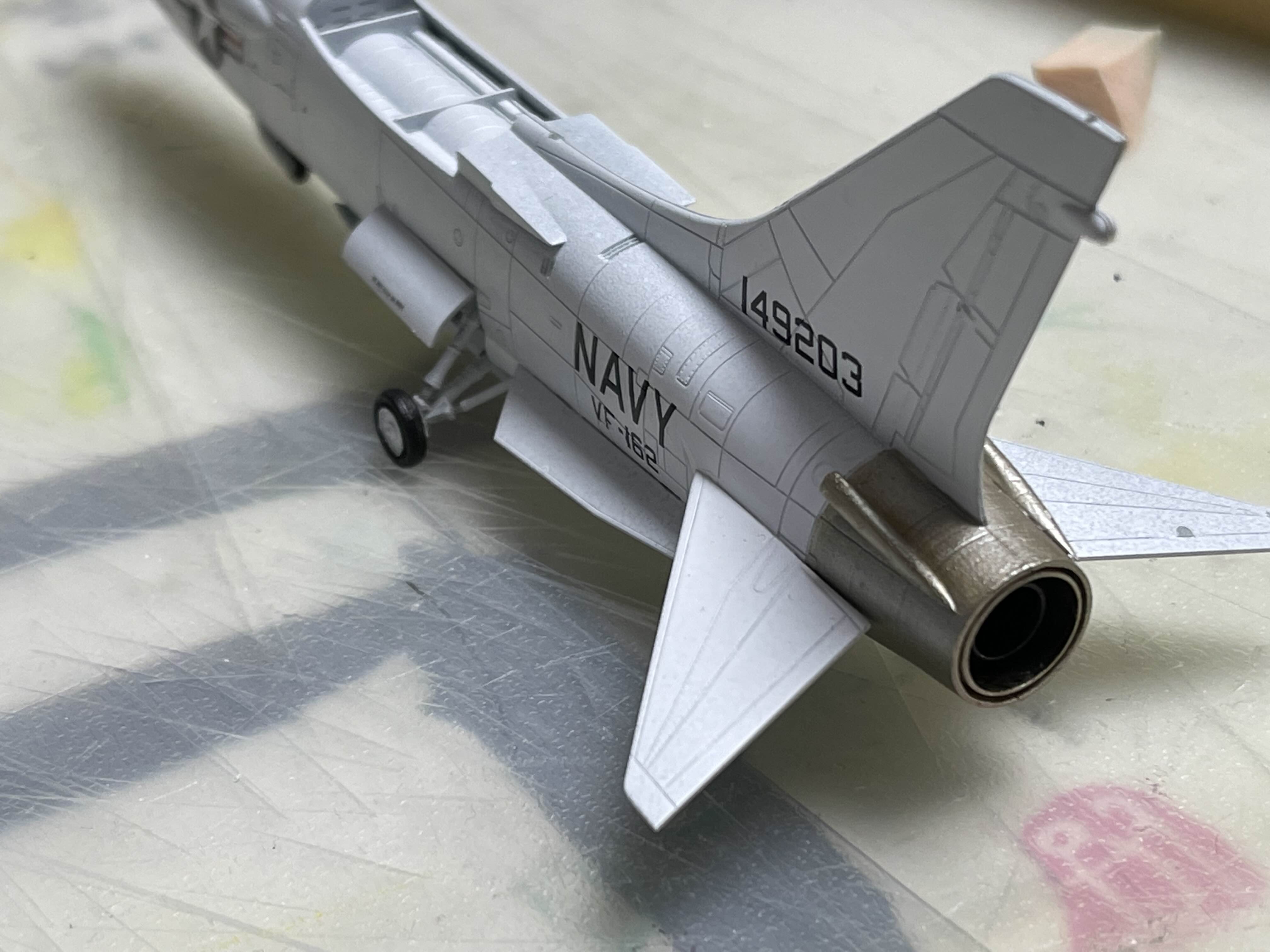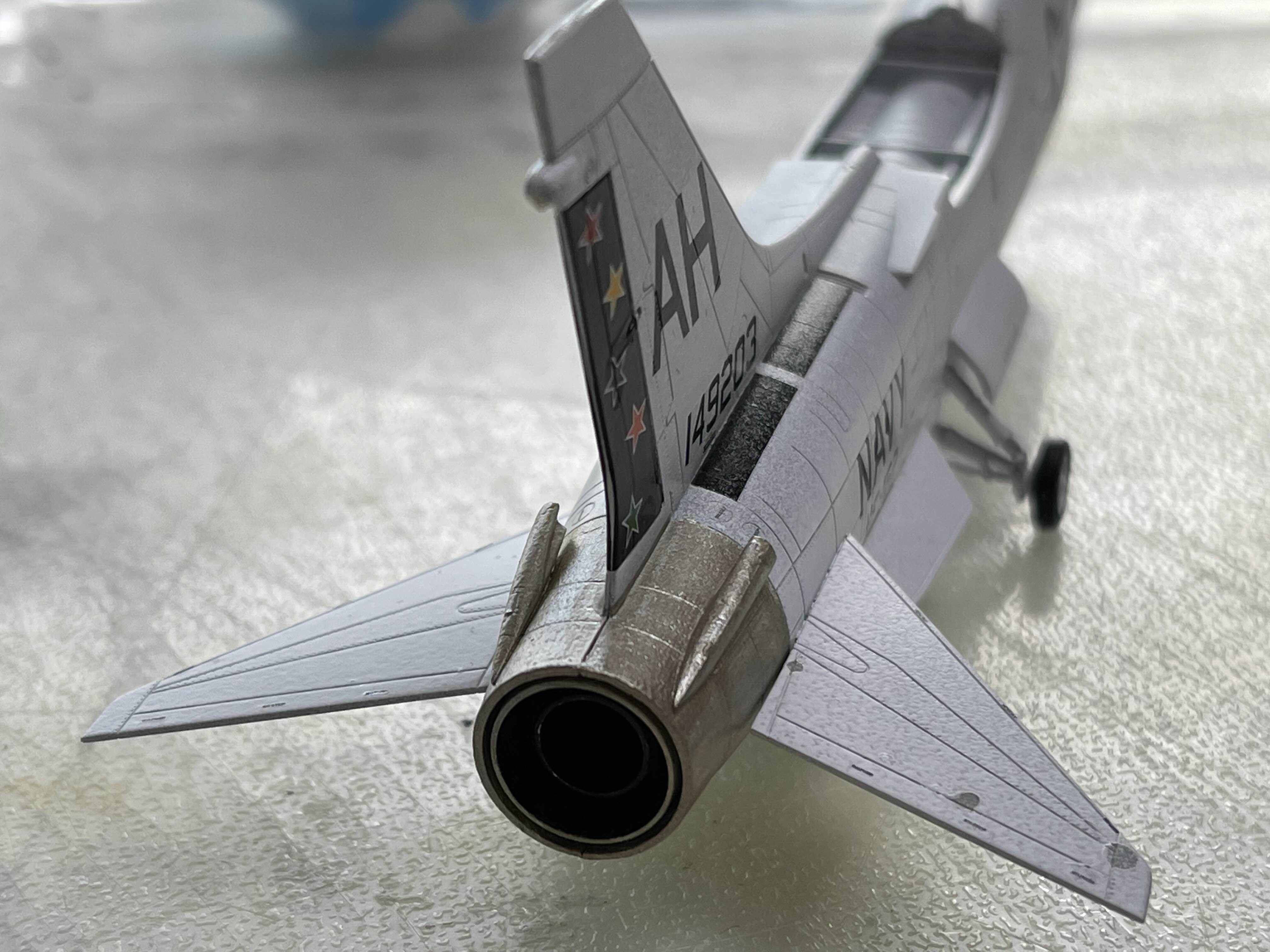 제트 노즐색이 좀 더 금속색이 아니라 금색에 가깝다 이 꼬리 날개에에는 뭔가 부자연스럽게 나온 곳이 있다. F-8 초기 버전에는 없는 ECM 안테나인데, 아무 생각 없이 데칼을 입히고 나서야 길이가 짧은 것을 알 수 있었다.