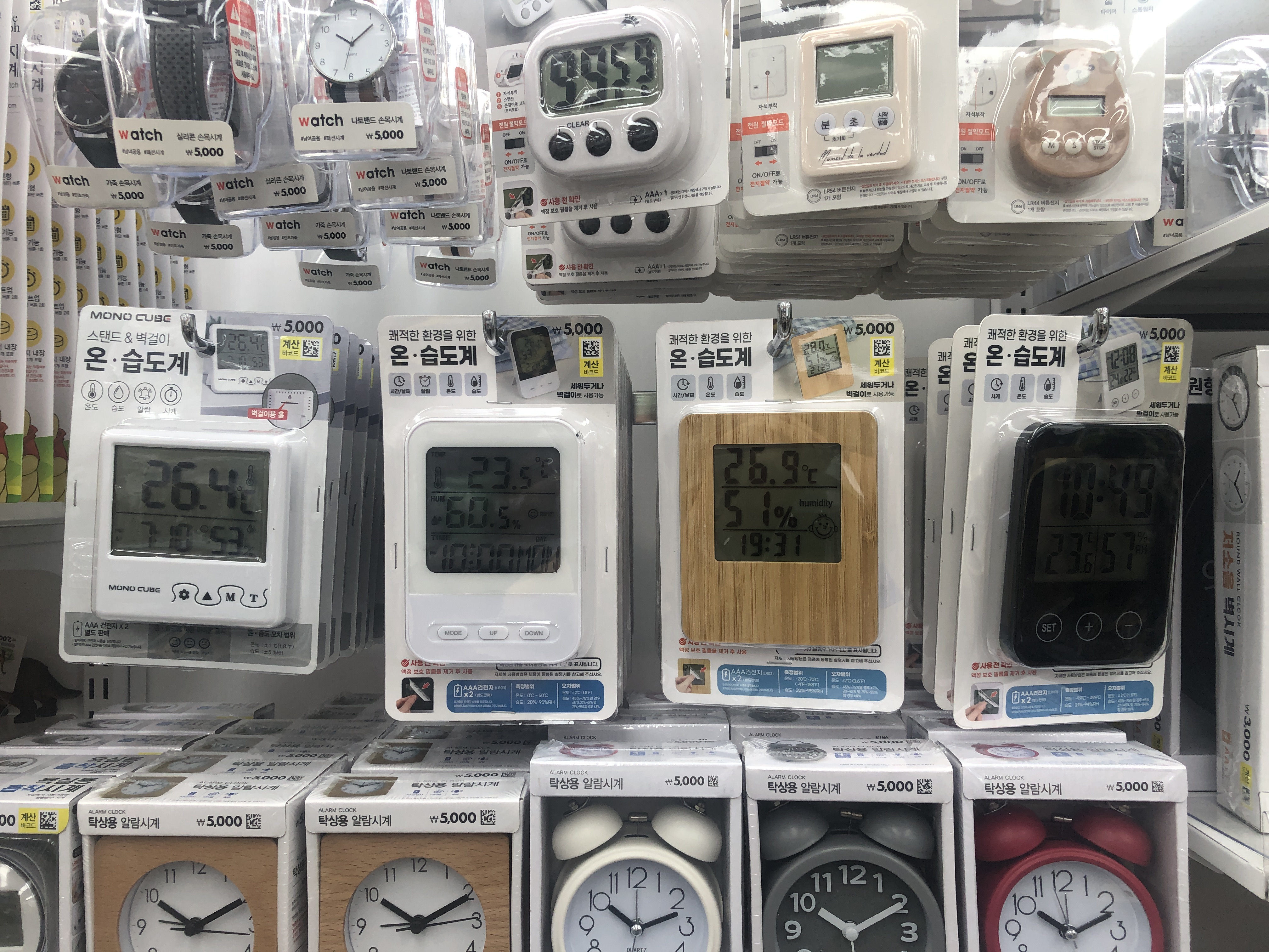 다이소에서 파는 각종 온습도계 온도/습도/날짜/시간이 LCD로 표기되는 것과 가격은 동일하므로 모양으로 어떤것을 선택할지 고민이었는데, 기능이 동일하다면 복잡한 것 보다는 단순한 것이 좋아 제일 첫 번째 것을 선택했다.