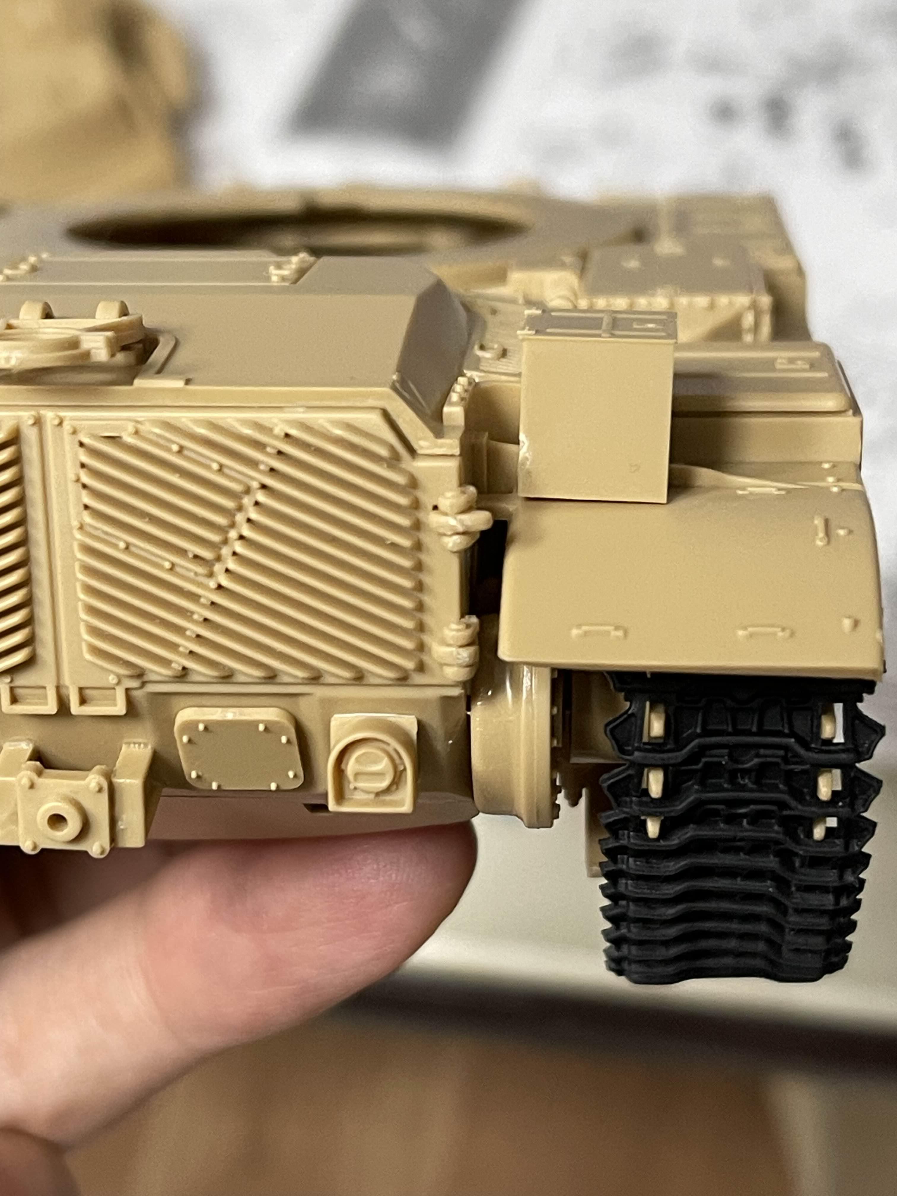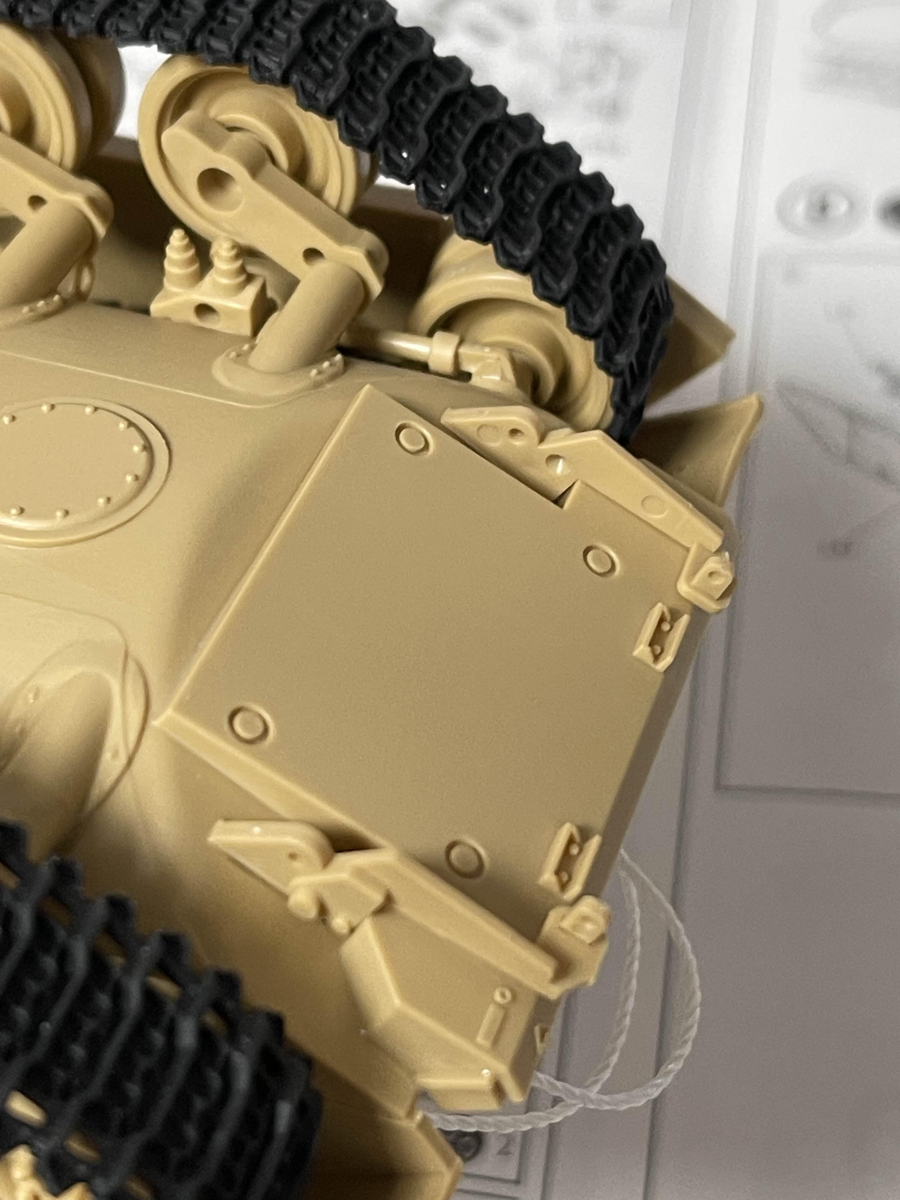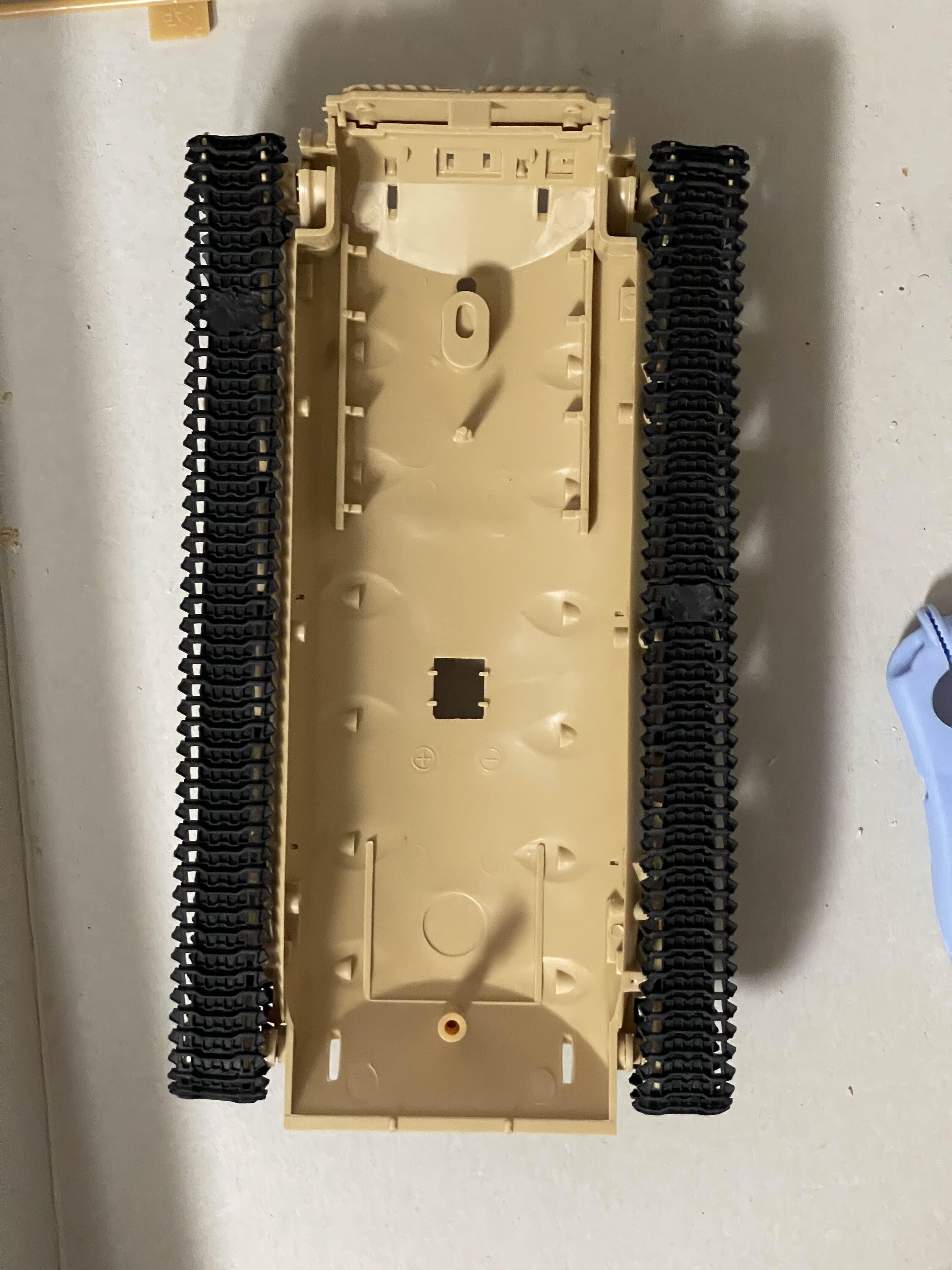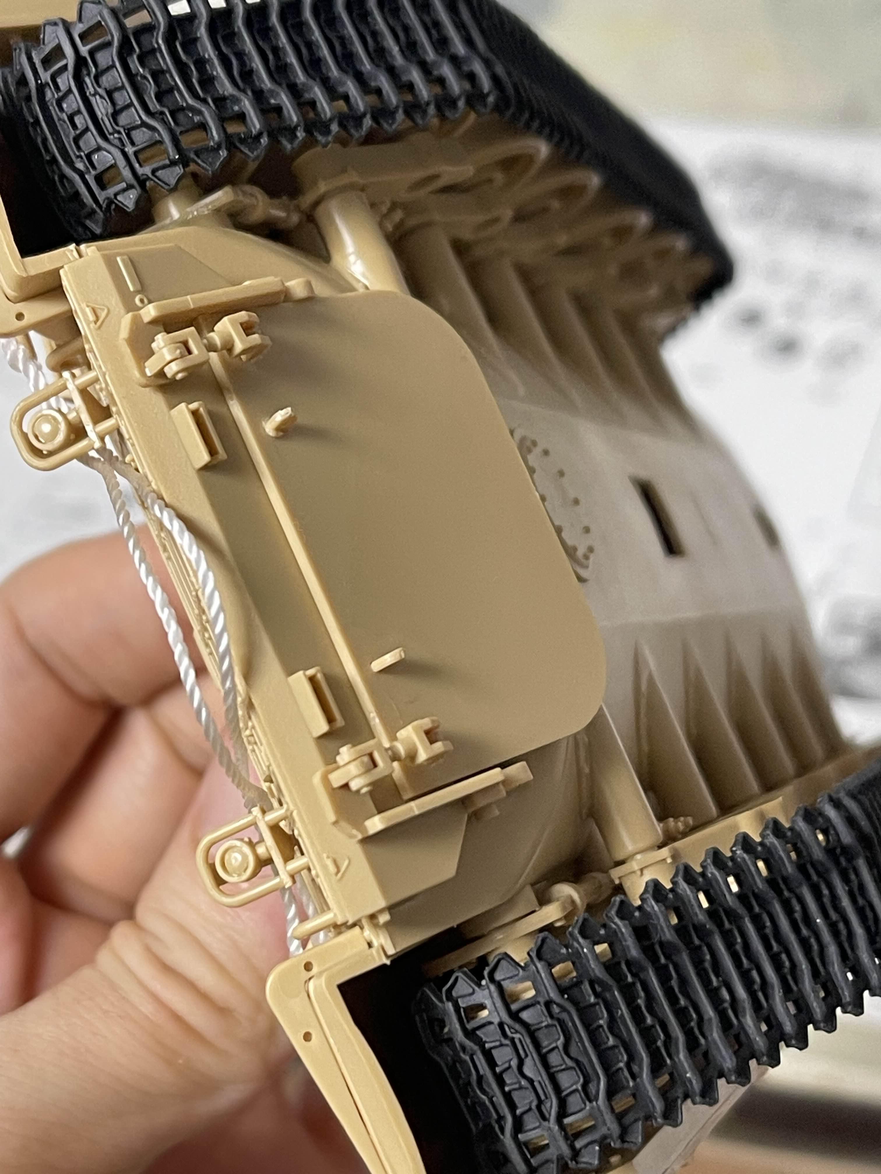 고무 궤도의 당김으로 축이 살짝 휘어진 모습을 볼 수 있다 플라스틱 사출로 만들어진 모델이라 중간 중간에 러너 자국이 조립에 방해되는 경우도 있다. 아래는 차체 하부에 붙이도록 되어 있었는데, 붙여 놓았을 때 뭔가 계속 떠 있길래 확인했더니 저렇게 튀어 나온 러너 게이트 자국이 간섭이 원인이었다.