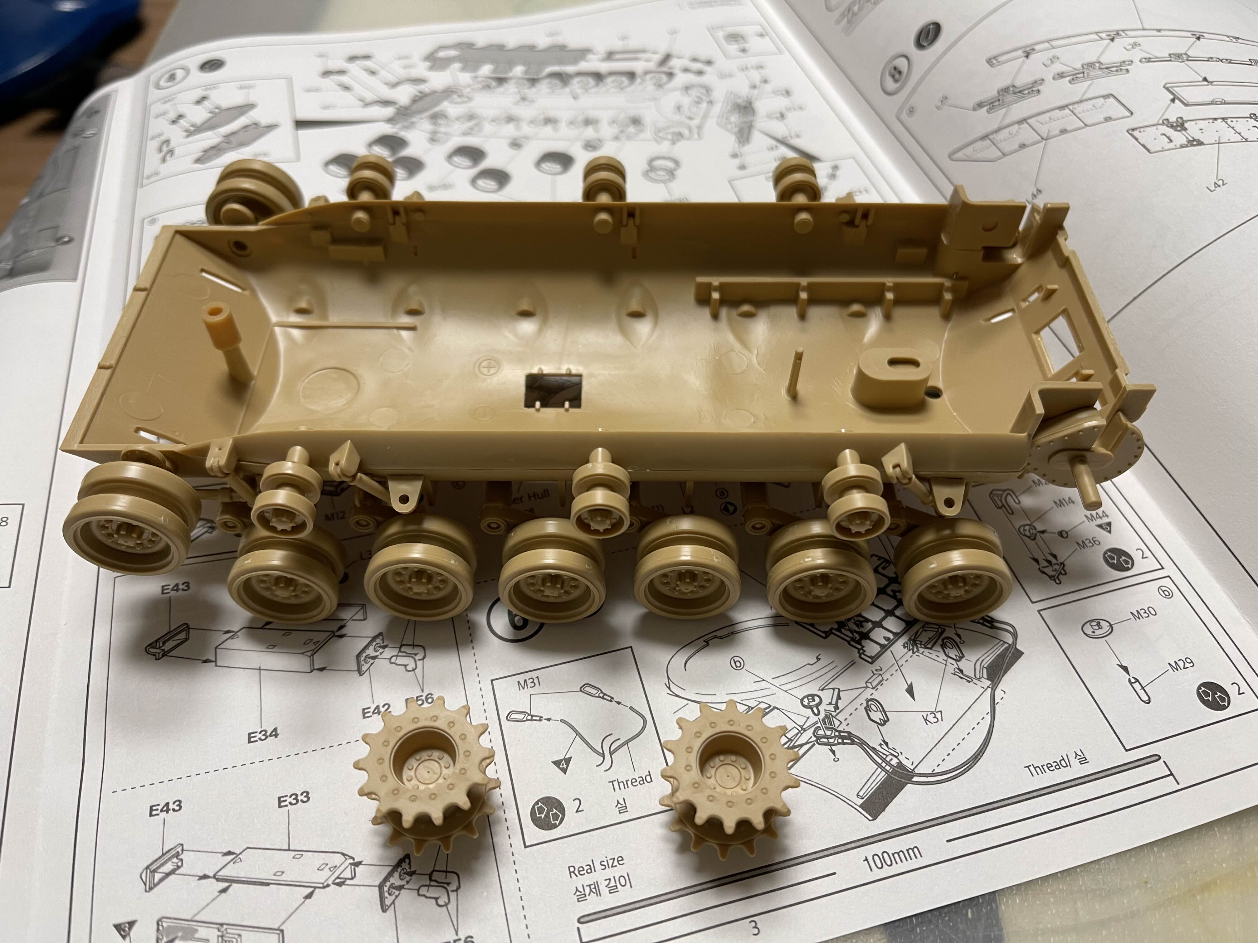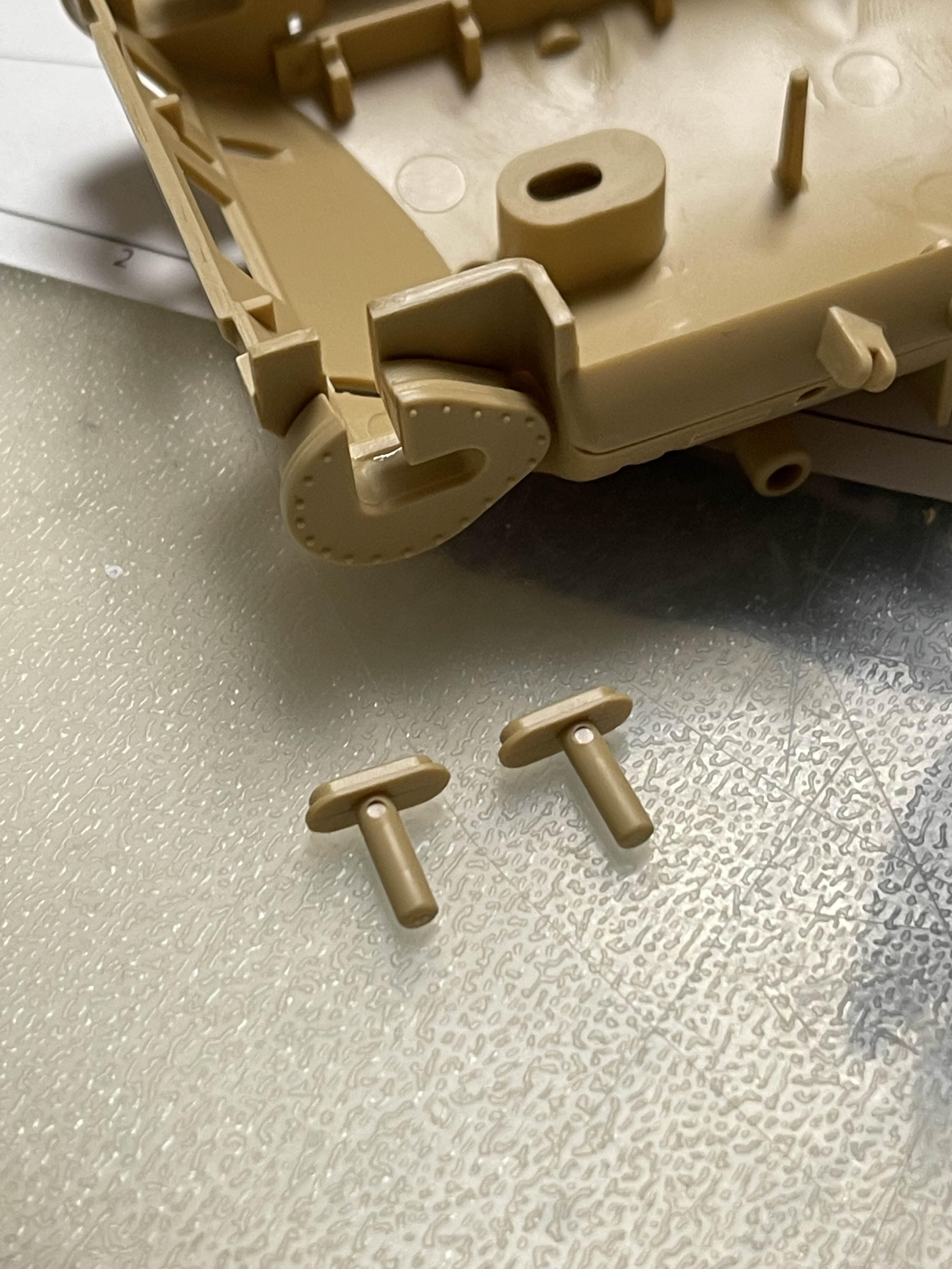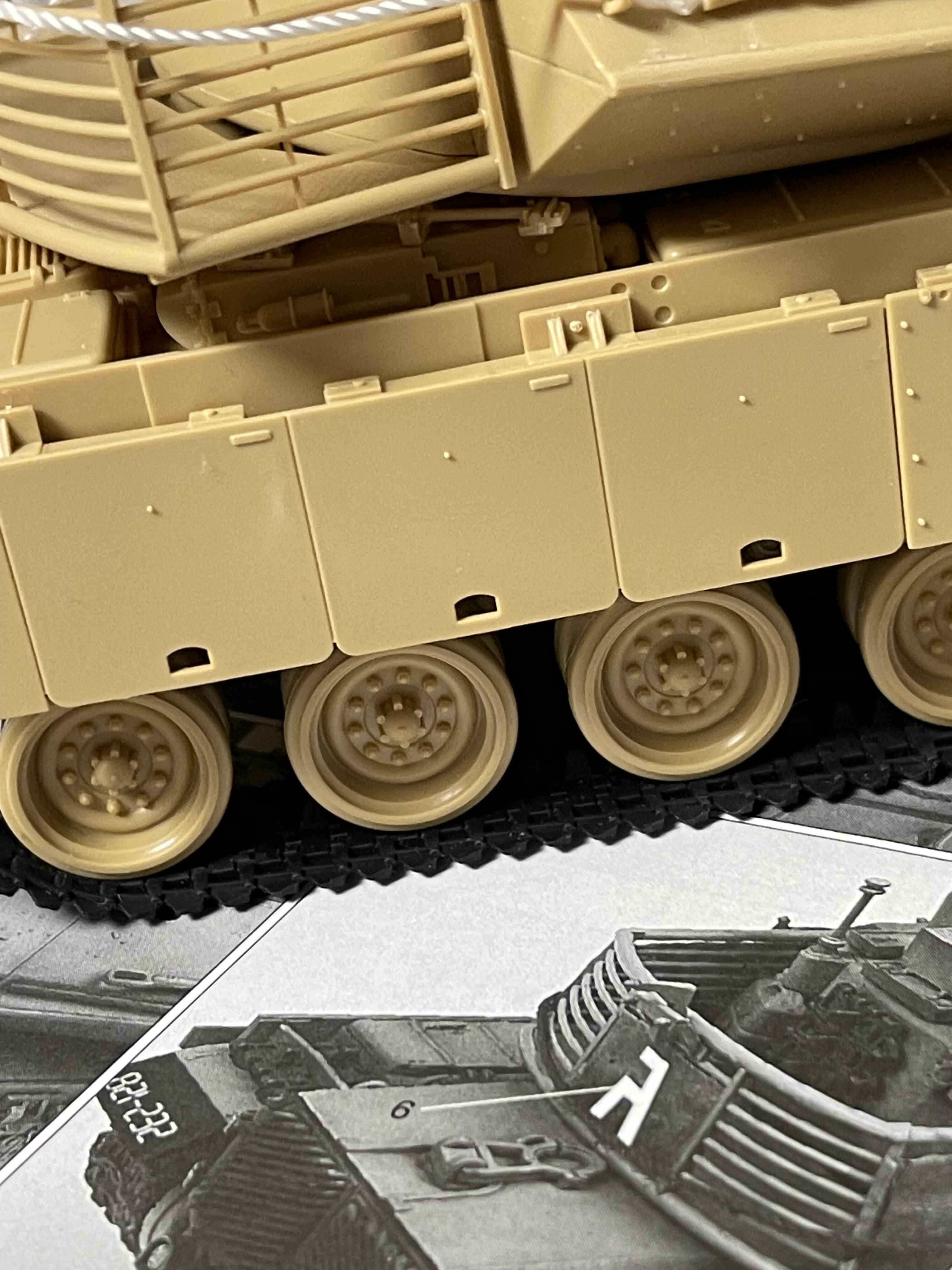 고무 궤도의 당김으로 축이 살짝 휘어진 모습을 볼 수 있다 플라스틱 사출로 만들어진 모델이라 중간 중간에 러너 자국이 조립에 방해되는 경우도 있다. 아래는 차체 하부에 붙이도록 되어 있었는데, 붙여 놓았을 때 뭔가 계속 떠 있길래 확인했더니 저렇게 튀어 나온 러너 게이트 자국이 간섭이 원인이었다.