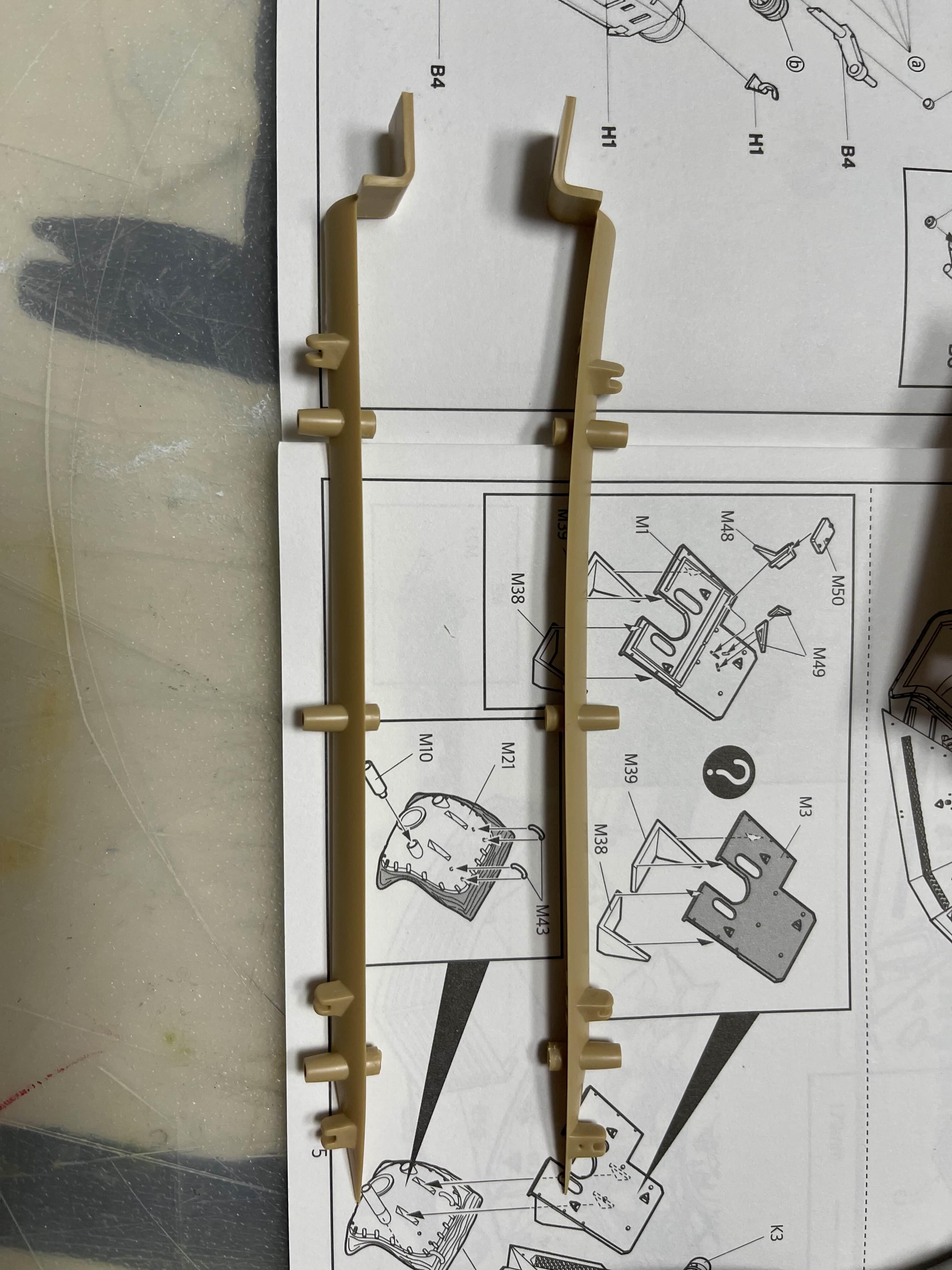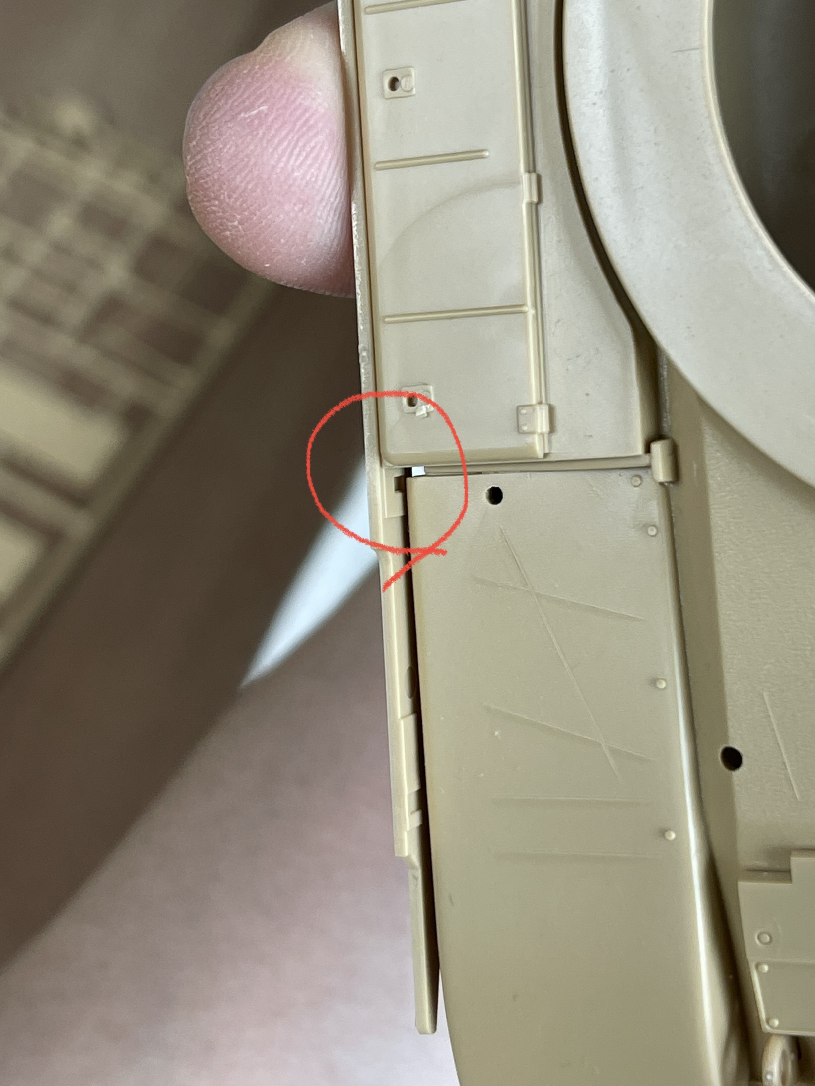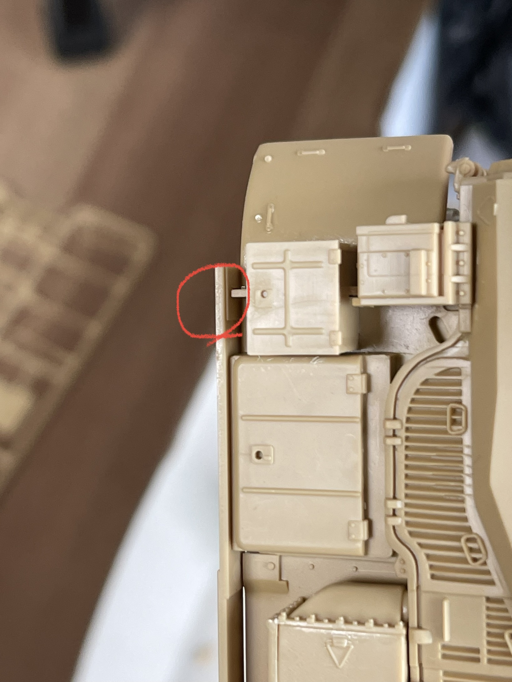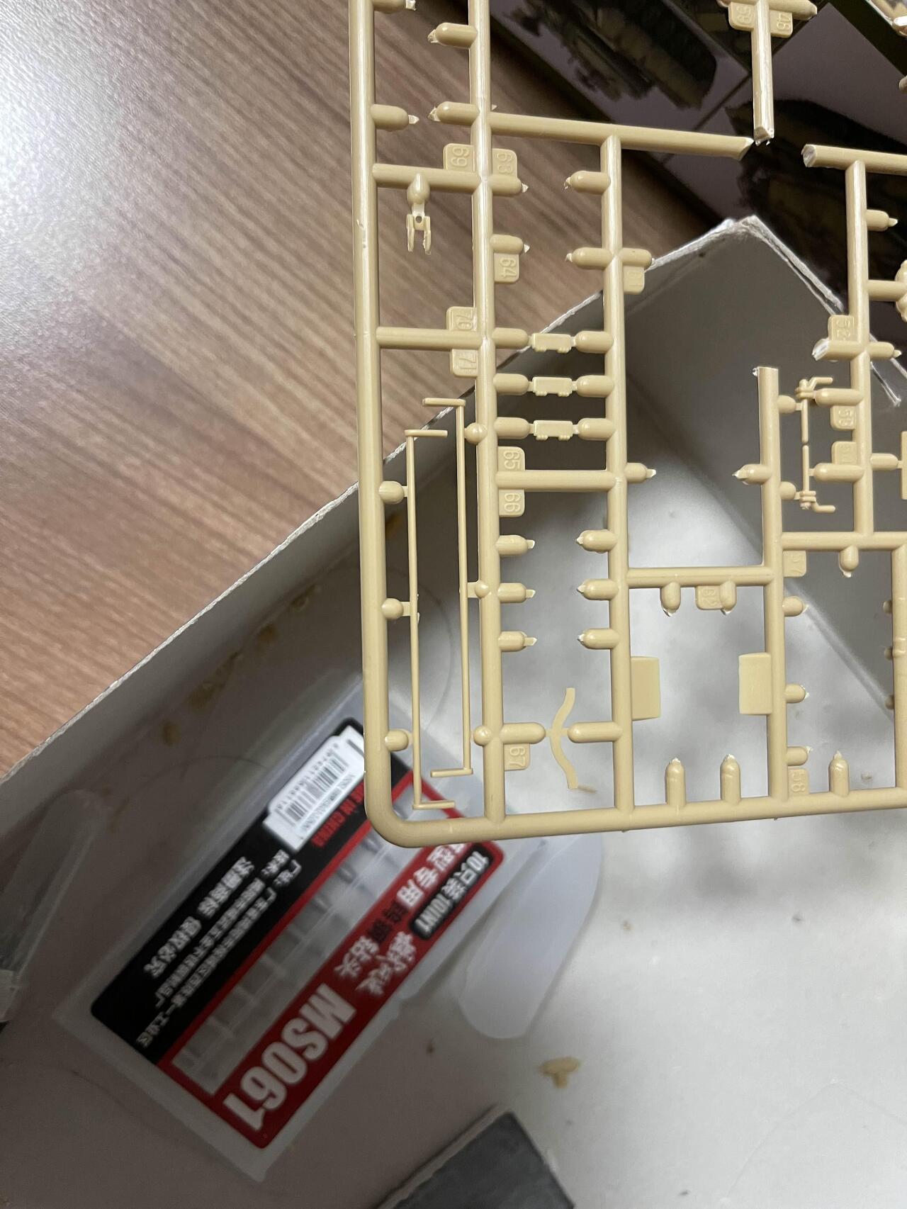 고무 궤도의 당김으로 축이 살짝 휘어진 모습을 볼 수 있다 플라스틱 사출로 만들어진 모델이라 중간 중간에 러너 자국이 조립에 방해되는 경우도 있다. 아래는 차체 하부에 붙이도록 되어 있었는데, 붙여 놓았을 때 뭔가 계속 떠 있길래 확인했더니 저렇게 튀어 나온 러너 게이트 자국이 간섭이 원인이었다.