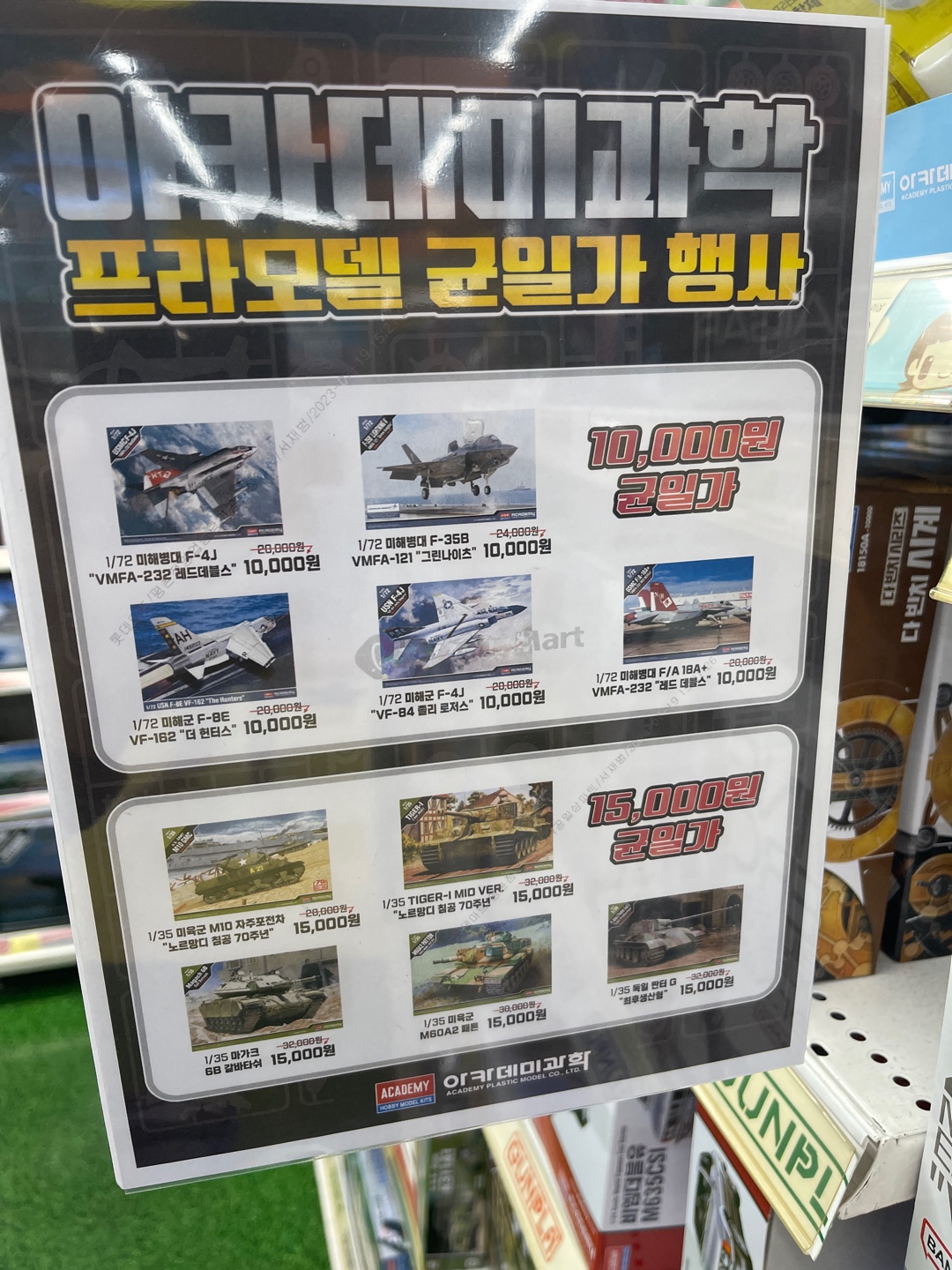 마트에 갈 때면 항상 프라모델 코너에 들려서 요즘엔 뭐가 나왔는지 확인하곤 했는데, 그날은 웬일로 아카데미과학 프라모델 균일가 행사를 하고 있었다. 작년 겨울에 만들었던 F-8E도 있고, 만들고 싶었던 F4 팬텀도 단돈 만원이라는 것을 보고 당장 사고 싶었지만, 차를 가져간게 아니라 어쩔 수 없이 구매는 다음으로 미룰 수 밖에 없었다.