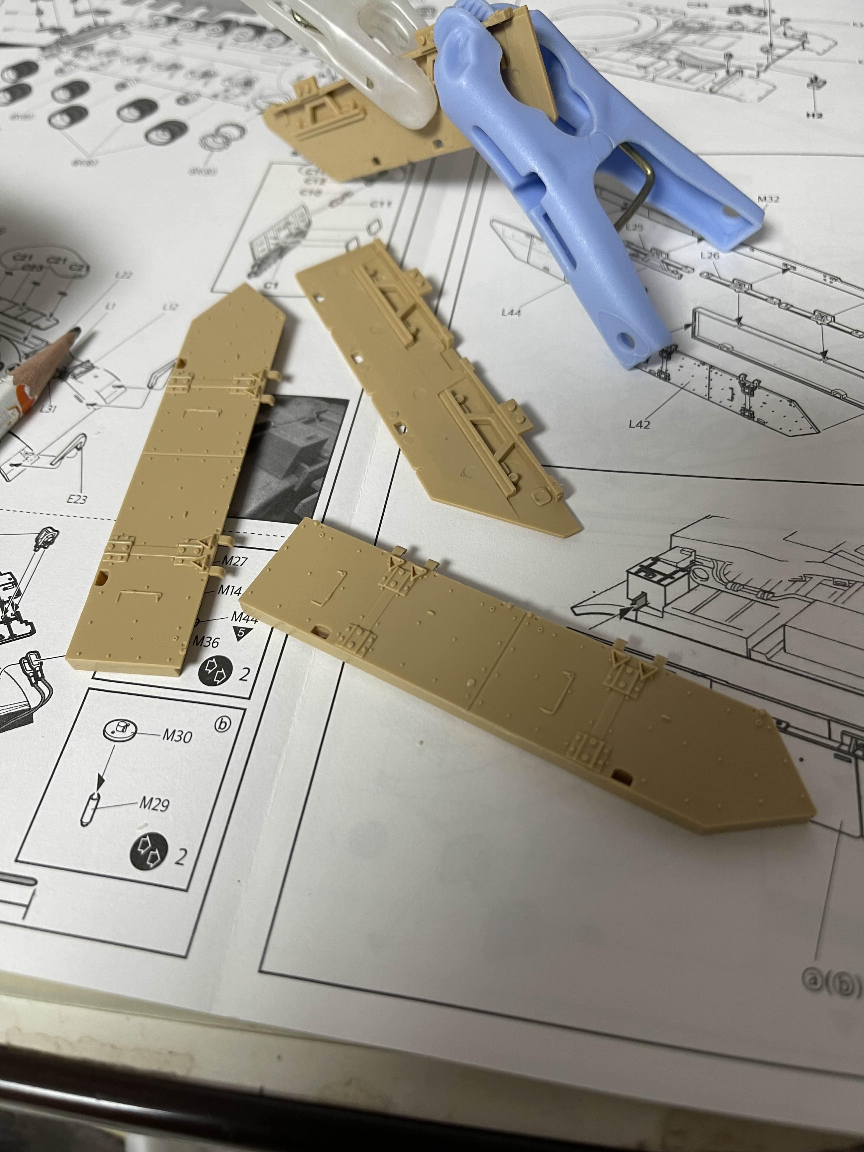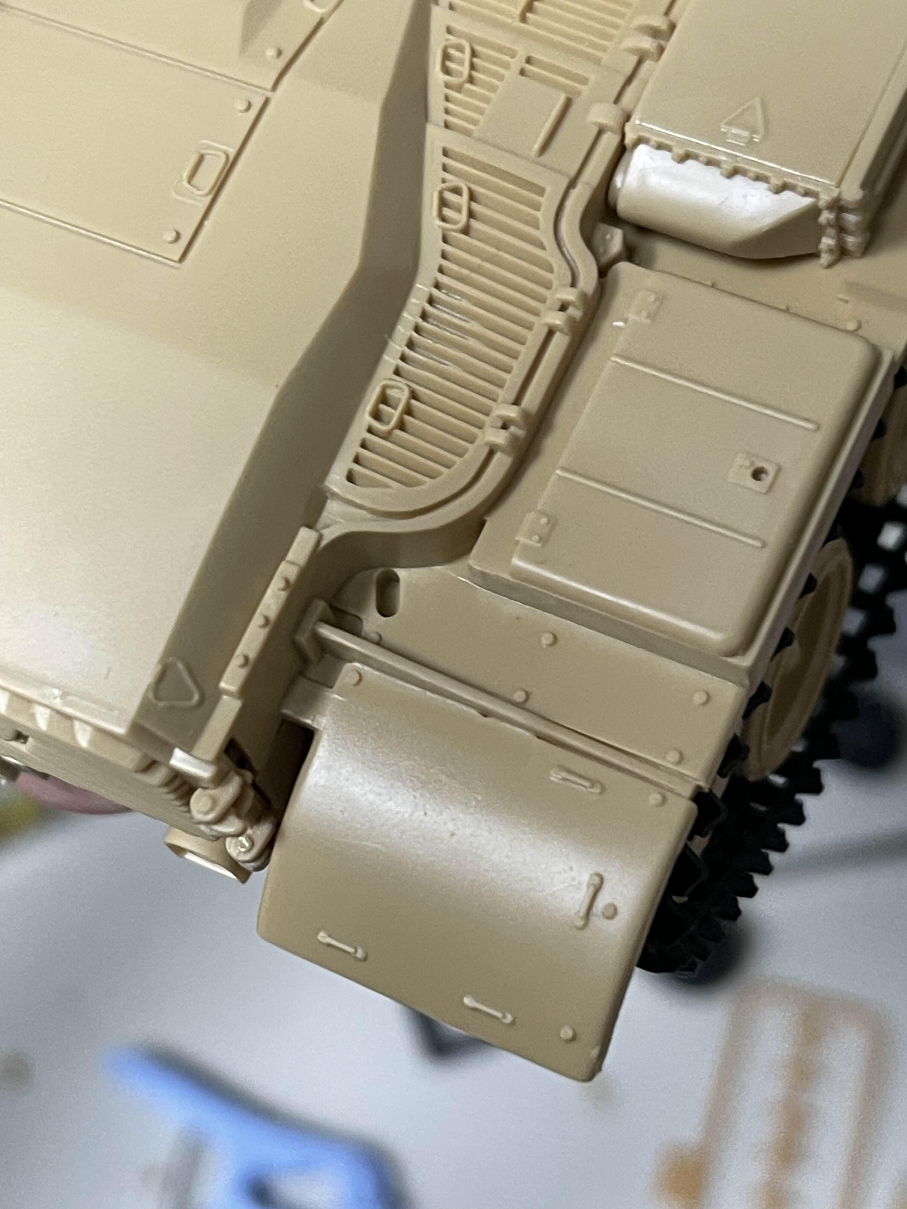 측면 장갑은 차체 상부와 부속과 연결된다. 근데 그 위치 차체 상부에는 뒷부분 연결부만 고정되어 있고, 나머지는 알아서 적당히(?) 붙이도록 되어 있다. 실제 사이트 패널에는 그 위치가 정해져 있으므로, 그 위치를 어긋나지 않게 하기 위해서 패널과 하나씩 맞춰 보면서 조립을 진행했다