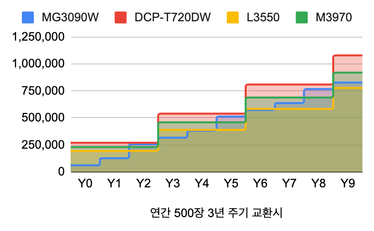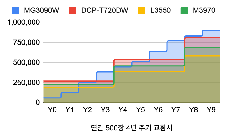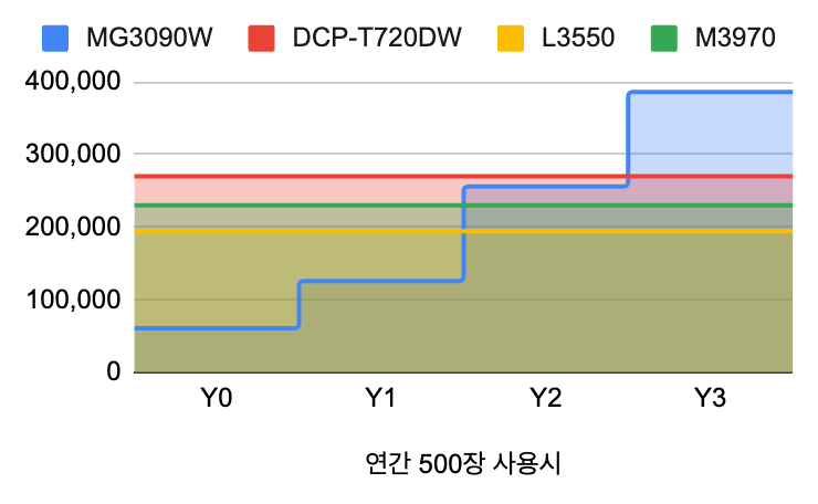 그렇다면, 1년 사용량이 500장인 경우는 어떨까? 그래프를 다시 확인해 보았을 때 연간 500장을 기준으로 해도 1년이 줄어든 2-3년 이내에는 카트리지 방식이 더 유리하다. 인쇄량이 많고 사용 연수가 길다면 당연히 무한 잉크 프린터의 사용이 유리하다.
