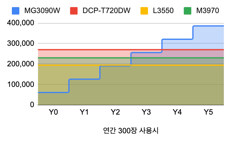 위에서 비교한 프린터들에 대해 본체 가격, 잉크의 평균 구매 가격, 인쇄 가능 매수 등을 비교하는 간단한 표를 만들면 다음과 같다.MG3090W DCP-T720DW L3550 M3970 프린터 61,000 270,000 194,500 230,000 검정+3색 잉크 65,000 31,000 36,000 45,000 인쇄 가능 매수 300 5,000 4500 6,000 자동양면인쇄 X O X O 자동급지장치 X O X O 용지함 X 150매 100매 100매 컬러인쇄속도 4ipm 16.5ipm 8ipm 6ipm 흑백인쇄속도 8ipm 17ipm 15ipm 12ipm